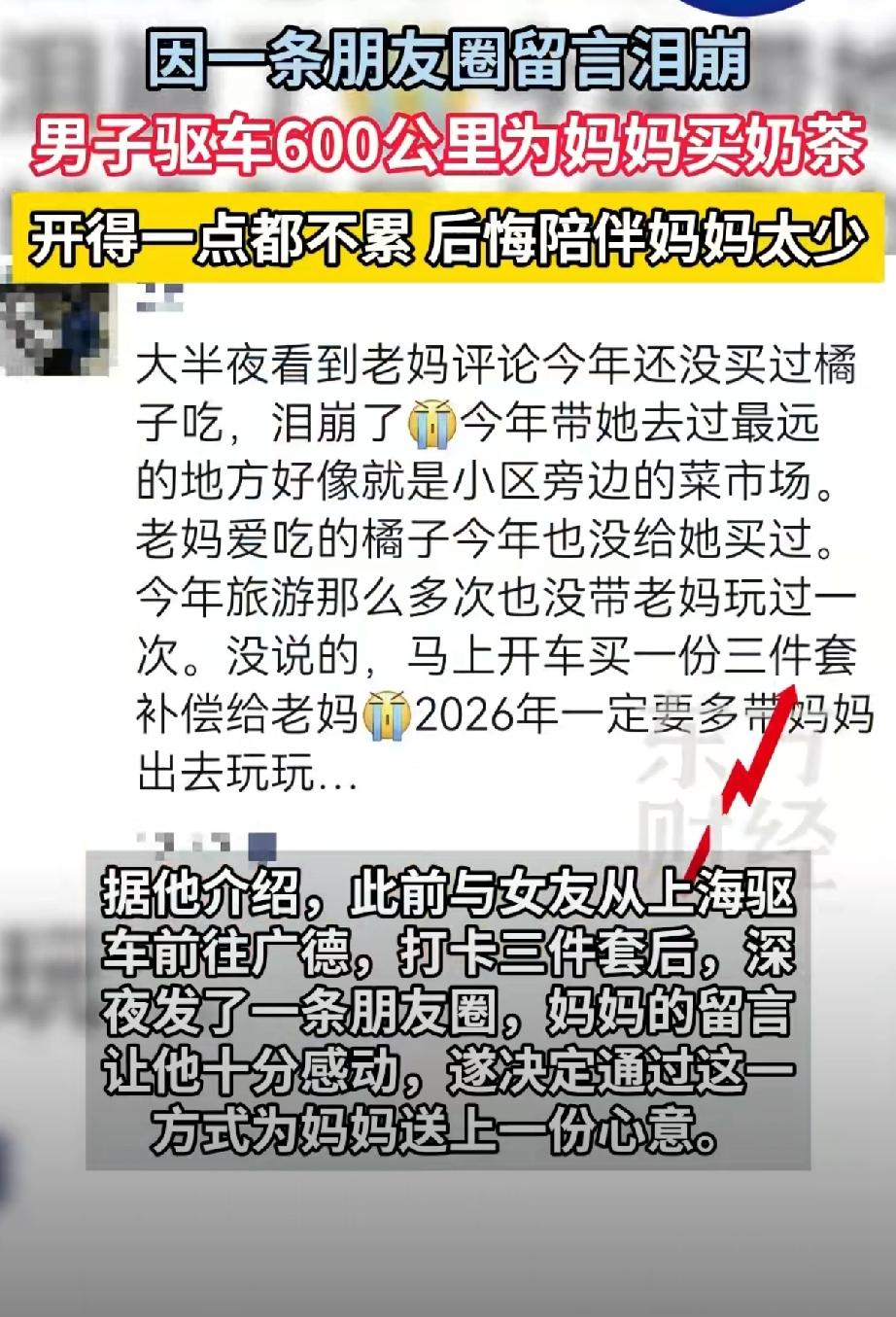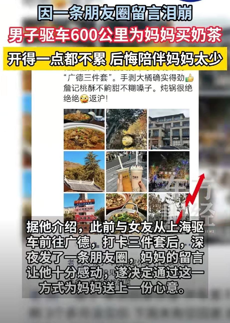 开600公里给老妈买奶茶,这事听起来挺疯的。可就在上周,一个上海小伙真这么干了。 他和女友从安徽广德玩完准备回上海,深夜发了条朋友圈。老妈秒回,字里行间全是牵挂。手机屏幕的光打在他脸上,他突然就愣住了——这些年,他带着女友天南海北地跑,却从没带老妈出过远门。 就这一个念头,他调转了方向盘。 第二天中午,他出现在了上海家里,手里拎着一杯奶茶。老妈又气又心疼,念叨着“这么远的路”“夜里开车多危险”“油费得多少钱”。他一边笑一边解释,说这车有辅助驾驶,稳得很,再说全程用电,花不了几个钱。 其实这些技术名词,老妈哪听得懂。但她听懂了儿子不想让她担心,也听懂了那份“想把最好的给你”的心意。 这事发到网上,话题其实妈妈也是爱喝奶茶的小女孩直接炸了。有人感动得稀里哗啦,说这是“当代孝心的诗意表达”。也有人掐着计算器质疑:600公里就为一杯奶茶,值吗? 要我说,质疑的人没看懂。 这哪是奶茶的事?这是一个儿子突然意识到,自己把太多时间给了爱情,却忽略了那个永远在他朋友圈底下等着的身影。600公里对他这个习惯长途的人来说,不过是个数字。但对老妈而言,那是儿子为他奔赴的距离,是被放在心上、被惦记着的证明。 有意思的是,今年3月,上海还有个更小的男孩,揣着10块钱零花钱给老妈买奶茶,钱不够,店员帮忙凑了。你看,孝心的表达方式在变,但内核从来没变过。 技术再发达,辅助驾驶再智能,也替代不了人心里那份“我想对你好”的冲动。真正该反思的是,我们是不是总把最耐心的陪伴给了外人,却把最敷衍的回应留给了家人? 别等600公里才能换回一杯奶茶的温度。常回家看看,哪怕只是楼下买杯奶茶,顺便上楼坐坐,老妈也会懂。