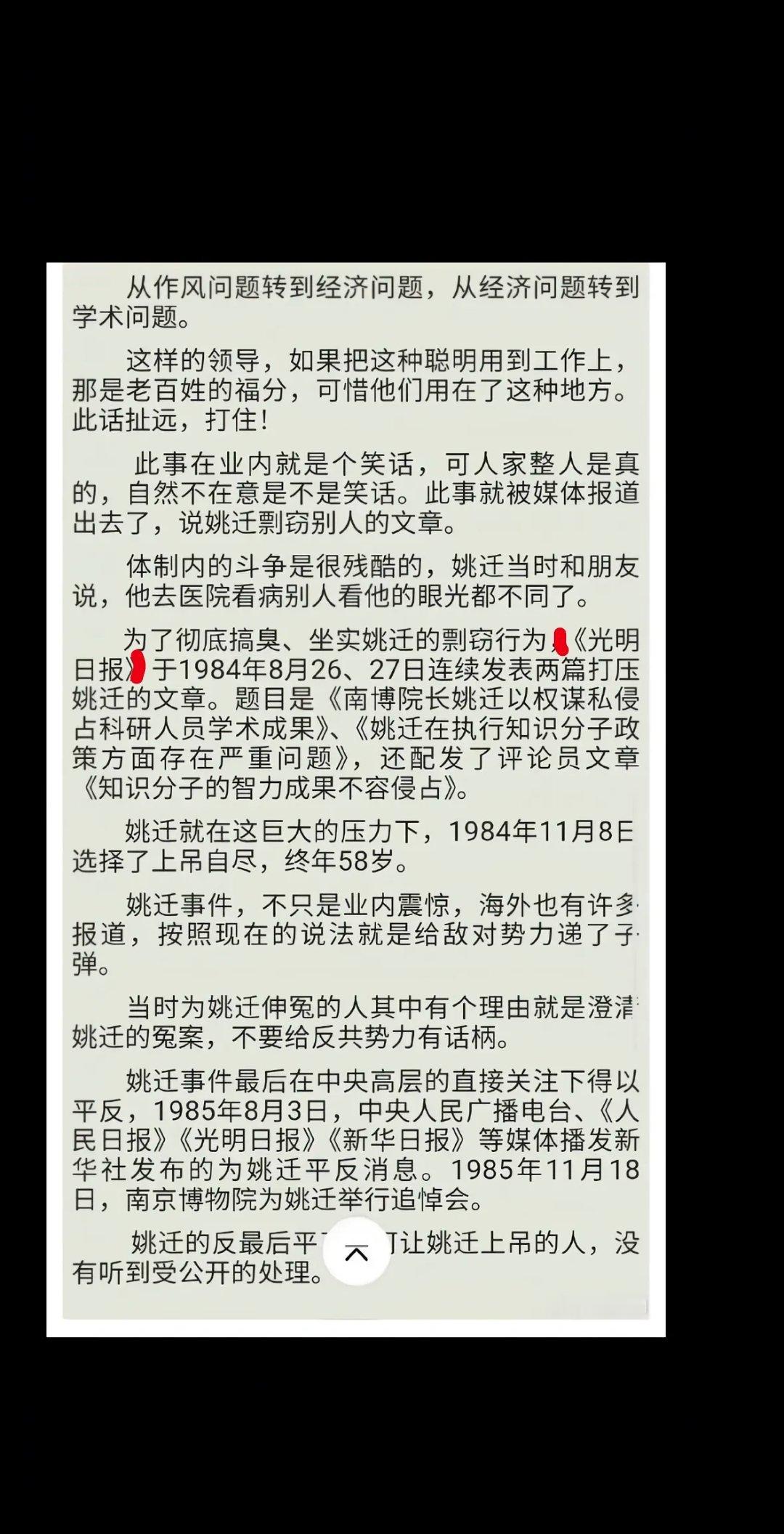 南博这事上了热搜,一回顾历史,发现光明日报当年也掺和在里面。有些媒体平时没啥流量,一般是写出了雅俗都共赏不了的内容,才被读者骂上风口浪尖。上一次我看到这家媒体,是写了一篇阴阳怪气伪鸡血文,说是工人要用加班来反击高市早苗。上上一次我看到这家媒体,是他们的评论部副主任董郁玉因间谍罪被判有期徒刑七年。这次我看到这家媒体,是他们在1984年连发两篇关于南博院长姚迁的文章。姚迁最后含冤自尽了。虽然后面上级部门给姚迁院长平反,但是这个过程确实让人愤慨。这让我明白一个道理,那就是狗尾巴草,你挖出它下面的根,它也是一株狗尾草,不可能是一株人参。南博前院长回应争议文物流出迷惑行为大赏南京博物院获赠名画现身拍卖市场