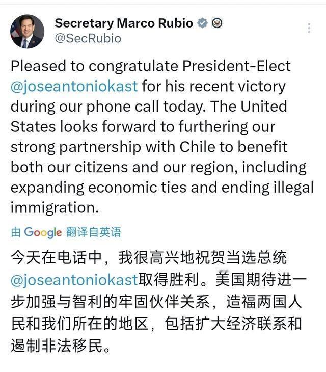 美国国务卿鲁比奥发文写道:“我很高兴地祝贺当选总统何塞·安东尼奥·卡斯特取得胜利。美国期待进一步加强与智利的牢固伙伴关系,造福两国人民和我们所在的地区,包括扩大经济联系和遏制非法移民。” 智利总统选举第二轮投票结束,何塞·安东尼奥·卡斯特以58%左右得票率击败对手珍妮特·哈拉,当选新一届总统。这位共和党领袖第三次参选终于成功,他的竞选重点放在打击犯罪和控制移民上,承诺大规模驱逐非法入境者并加强边境管理。卡斯特出身德国移民家庭,父亲曾加入纳粹党,他本人多次公开肯定皮诺切特独裁时期某些政策,立场属于极右翼。选举结果一出,右翼阵营庆祝声一片,拉美地区右转趋势又添一例。 美国那边反应特别快。美国国务卿马尔科·鲁比奥发声明祝贺卡斯特胜选,说美国期待在新领导下推进公共安全、结束非法移民流动并恢复双边贸易关系。声明里强调相信卡斯特政府会加强社会安全和对美贸易。鲁比奥还打电话给卡斯特,再次转达祝贺,表达美国致力于深化伙伴关系,包括区域安全和经济增长。鲁比奥公开部分通话内容,突出双方在移民控制和经济联系上的共同点。这种连续声明加电话的动作,显示华盛顿对卡斯特上台高度重视。 说实话,这么急切示好不是没原因。卡斯特立场强硬,反移民、亲市场,跟特朗普政府思路对得上路。美国现在推“美国优先”,拉拢类似政客能帮着推进区域议题,尤其是遏制非法移民和扩大贸易。智利作为南美重要国家,资源丰富,美国自然想稳住关系,避免其他势力插手。鲁比奥这些表态,看起来热情十足,背后就是想尽快锁定合作方向。 与中国这边对比就明显。中国是智利最大贸易伙伴,铜和锂出口大头都去中国,2024年智利对华出口占总出口近四成。卡斯特上台后,双边经贸会不会受影响,大家都在观察。他之前没特别针对中国,但美国这么积极拉拢,难免让人多想一层。智利发展离不开务实合作,希望新政府能平衡好各方利益,别因为外部压力影响自身经济。 卡斯特将于2026年3月11日正式就职,任期四年。现任总统博里奇已打电话承认结果,并安排过渡会面。国际上,阿根廷总统米莱等右翼领导人发贺电庆祝。未来智利政策预计更注重治安和边境控制,与美国在贸易安全上协调会增多。整体看,这事反映拉美政治风向变化,也提醒各方关系要稳扎稳打。