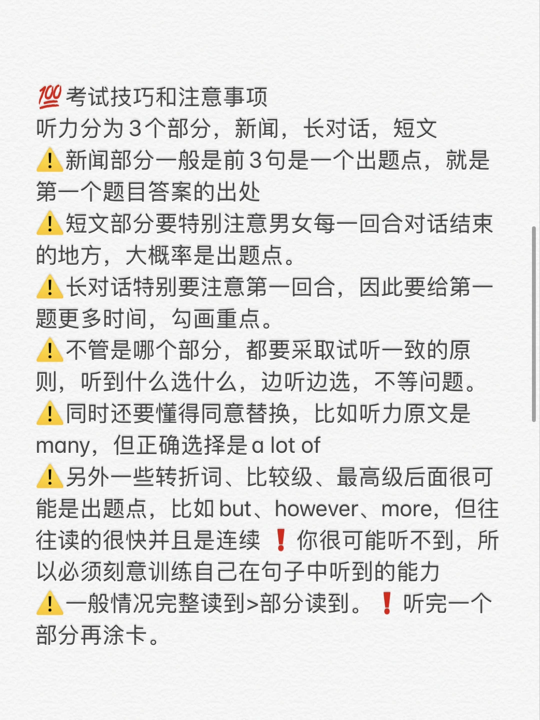 ⚡ 万能技巧: • 视听一致:听到什么选什么 • 边听边选,不等问题 • 注意同义替换:many = a lot of • 转折词后必出题:but、however、more • 完整读到 > 部分读到 • 听完一部分再涂卡