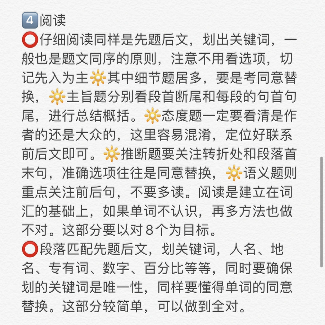 🔍 题型攻略: • 细节题: 重点考同义替换 • 主旨题: 看段首段尾+每段首尾句 • 态度题: 区分作者vs大众态度,易混淆 • 推断题: 关注转折处+段落首末句 • 语义题: 重点看前后句,别多读