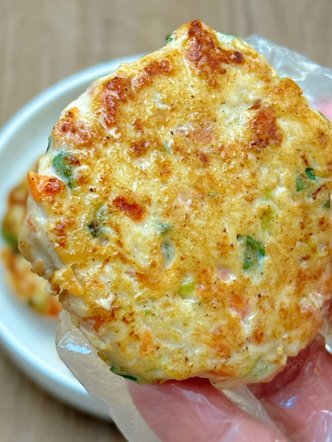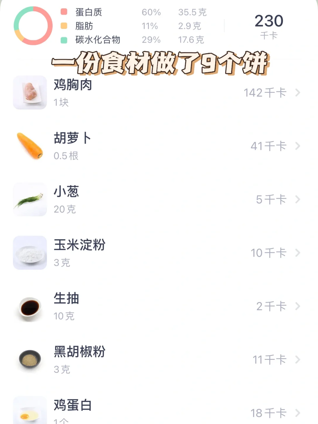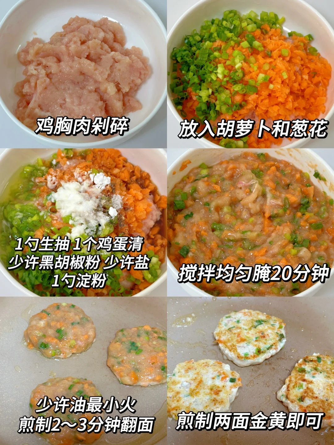 🥗食材:鸡胸肉1块、胡萝卜、葱花(做了9个饼)