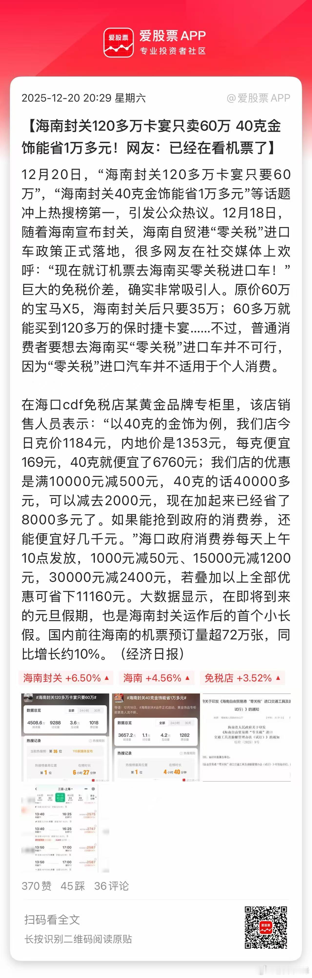 封关的第一个周末,海南又冲上热搜了!原因是巨大的免税价差,“120多万卡宴只要60万”,“40克金饰能省1万多元”、“一台苹果手机最高可减2140元”,就问你们心动不心动。很多人对封关的理解,去海南是不是得办签证了?免税店物品是不是更丰富了?能买的奢侈品是不是更多了?其实吧,你的想象力完全可以再大一些;比买买买更重要的,海南承担了重大的历史使命,就是要成为世界上最大的自由贸易港。说说海南封关后的几个优势:1、买东西免税。合计约6600种的商品都是免税的,占比高达74%,以后海南就是一个巨大的免税城。大家可以买买买,当然每人一年额度限制为10万。2、个税减免。在海南的个税最高只用交15%,而内地个税最高是45%。你如果年薪百万,一年到手能多出20多万。这对人才极具吸引力。3、企业所得税减免。海南企业所得税最高只有15%,而内地是25%!这对高新企业也极具吸引力。4、放松外汇管制。普通人内地每年能换5万美元,海南是10万美元,购汇额度多出了一倍!个人还能申请一个FT账户,后面应该可以投资港股、美股等等。总之,海南是不是下一个香港,新加坡,或者迪拜,还是青出于蓝胜于蓝呢。这次封关就是巨大的契机,逆天改命,在此一搏!对A股来说,最利好当然是海南板块,还有航空酒店、免税这些方向也受益。不过海南股很多量化资金在玩,出利好总是兑现,你没期待时它反而大涨,典型的渣男啊。