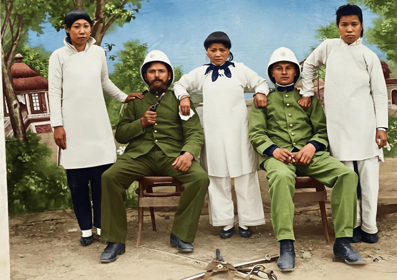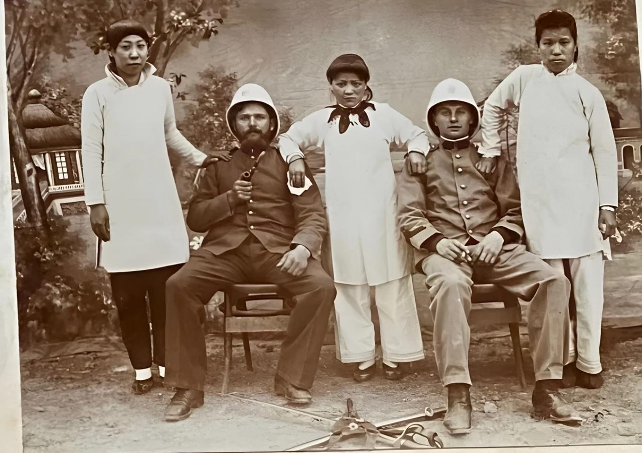 这是1900年代天津的一张摆拍合影,由驻津法国兵拍摄,照片中两位身着军装的法国兵坐于前排,一人手持烟斗、姿态松弛,尽显征服者的随意;后排及两侧的三位中国女性身着素色长褂,肢体姿态拘谨局促。