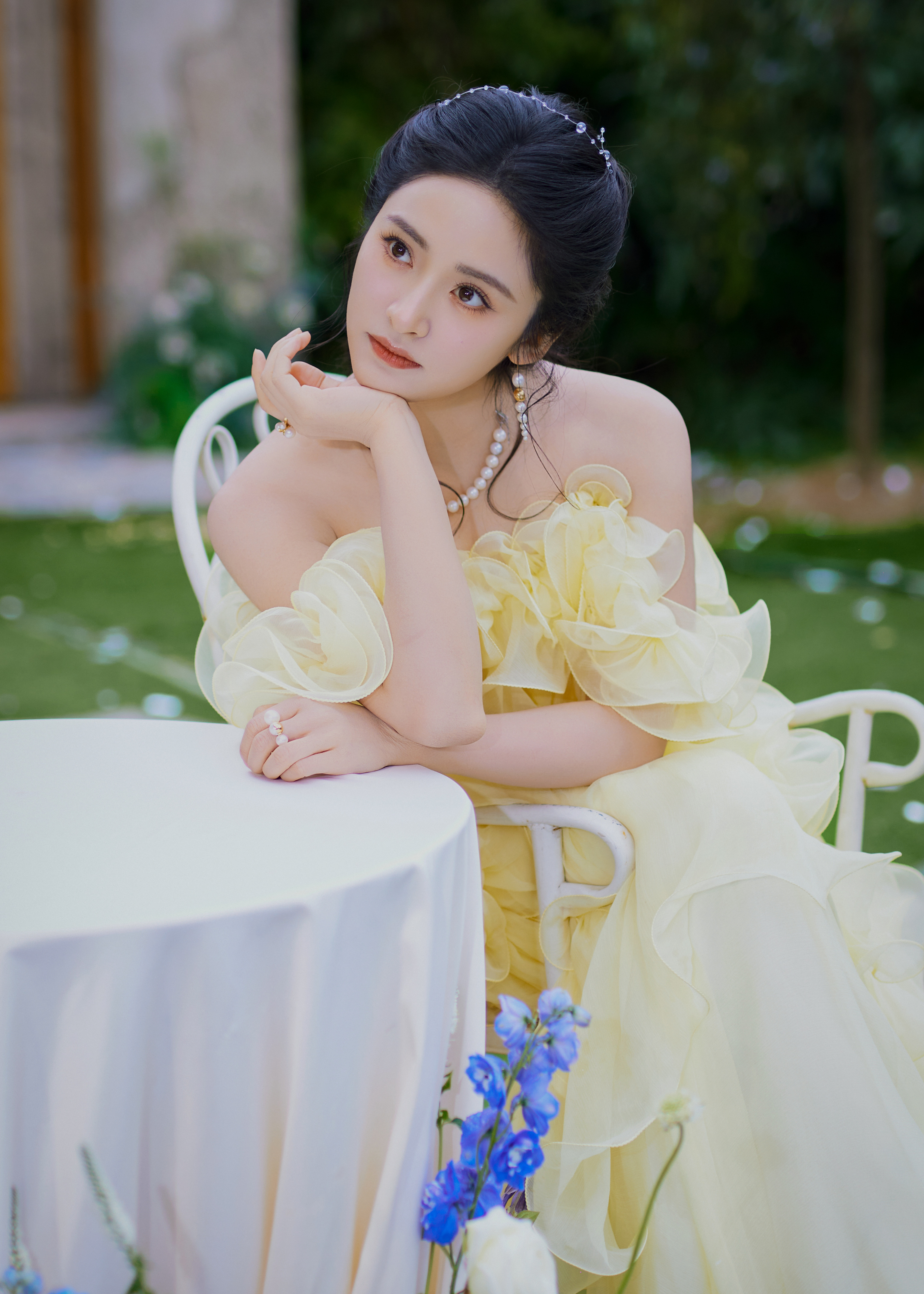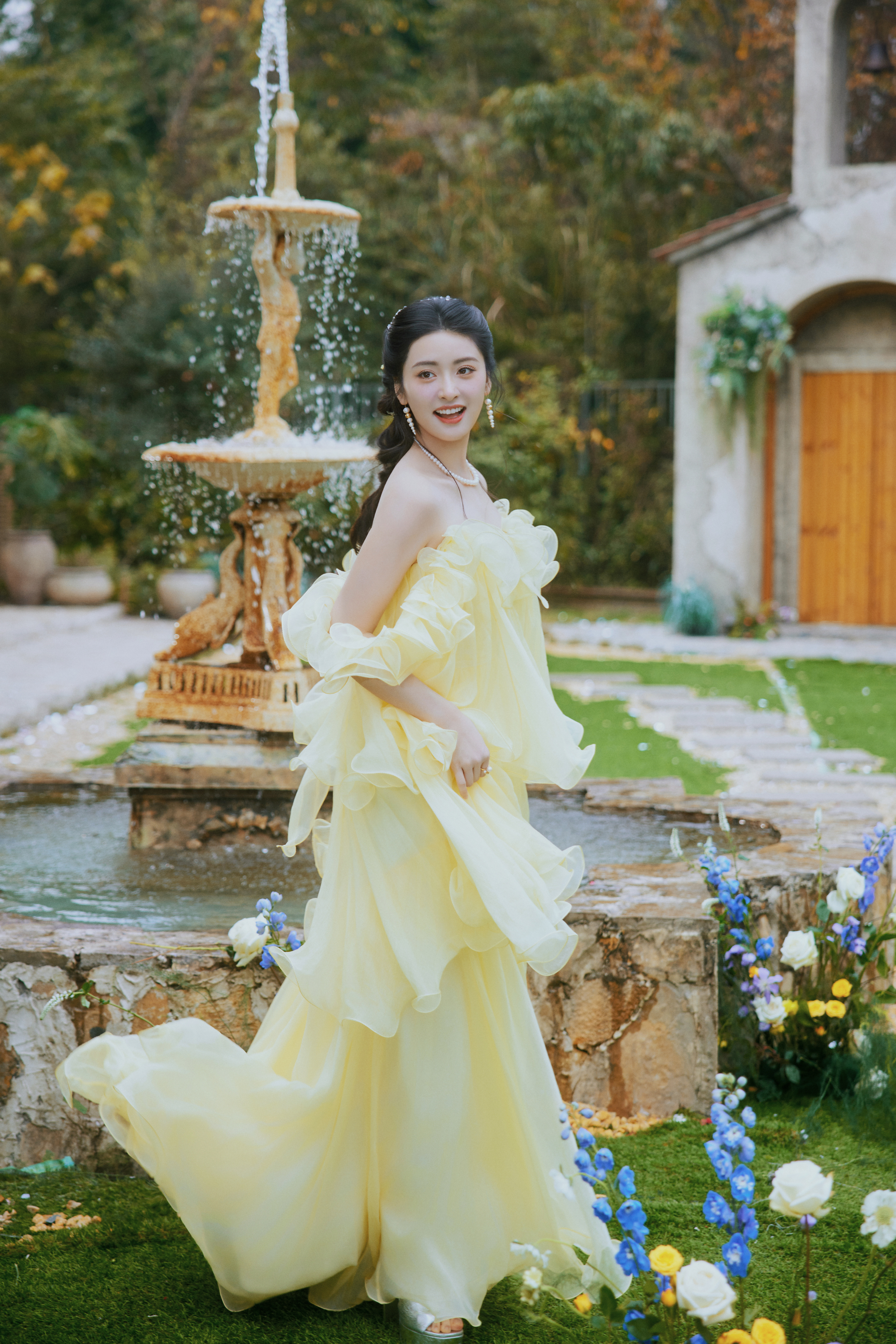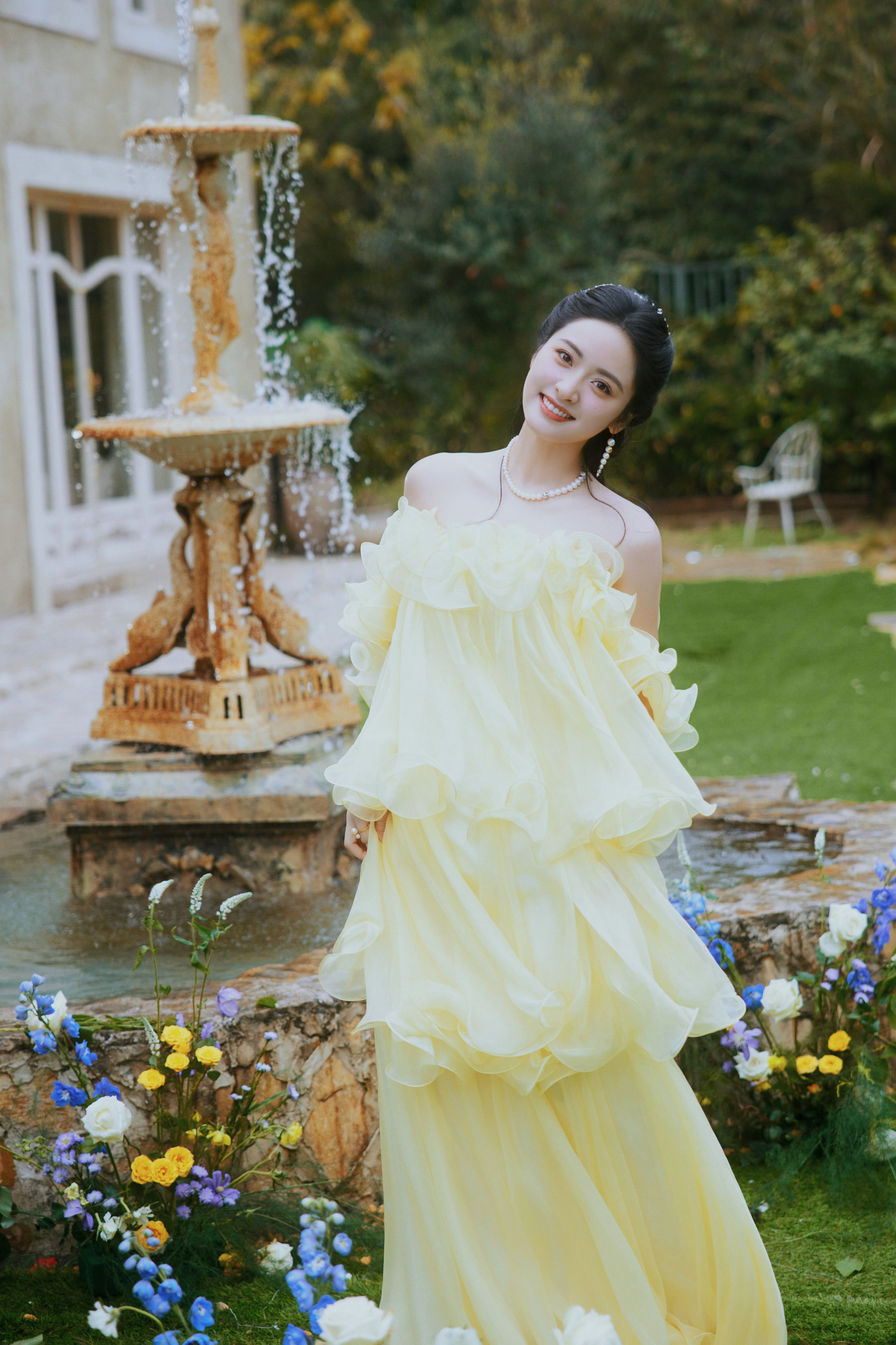 沈月 一字肩的浪漫,被鹅黄裙摆揉成了温柔的形状,气质藏在每一缕飘动的纱里。