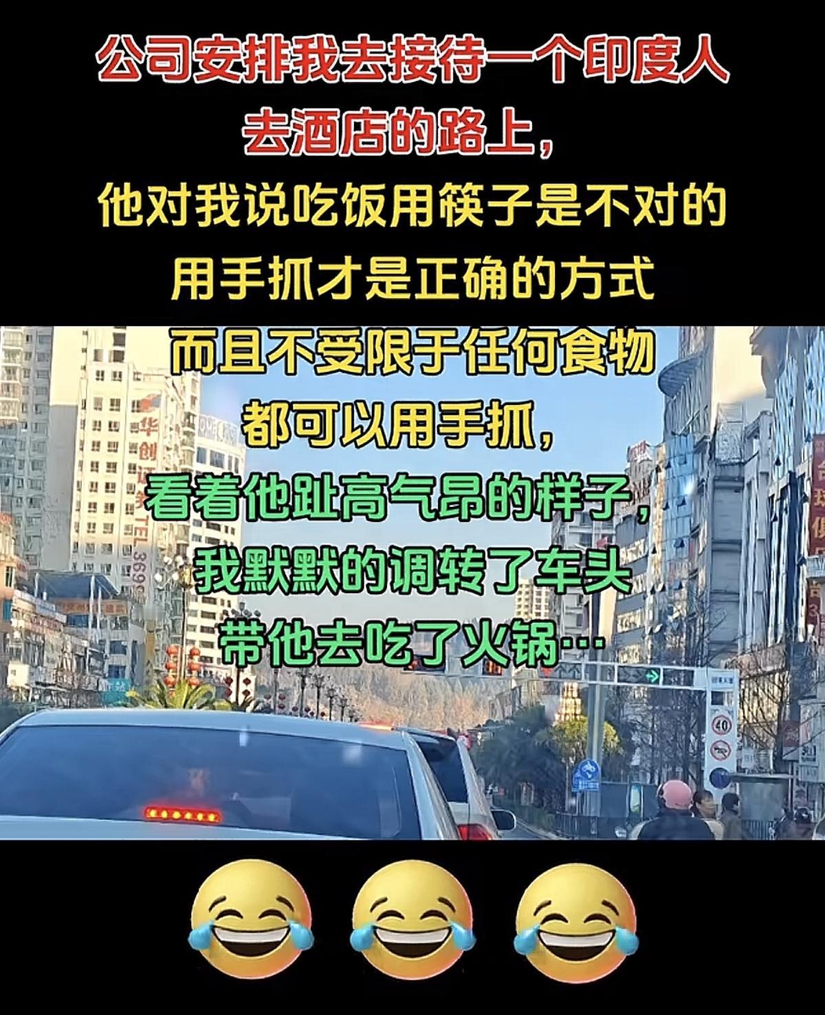 这位博主也是一个人才,如果是这样的话,他接待的印度客户,接下来要怎么应对呢?吃别的菜还可以手抓,吃火锅怎么手抓呢! 吃火锅不用筷子,还是需要技术的。当然,也有一个办法,那就是先用漏勺把火锅里面煮好的菜,舀上来,放在调料碗里。这样菜冷却了,再用手抓着吃,也是可以的。 或许,也只能用这种方式,才能让他的印度客户,吃到不烫手的火锅。如果直接用手去火锅里取菜吃,肯定是不行的。毕竟是饮食文化不同,使用餐具不同,带印度客户去吃火锅,有点“不地道了”。