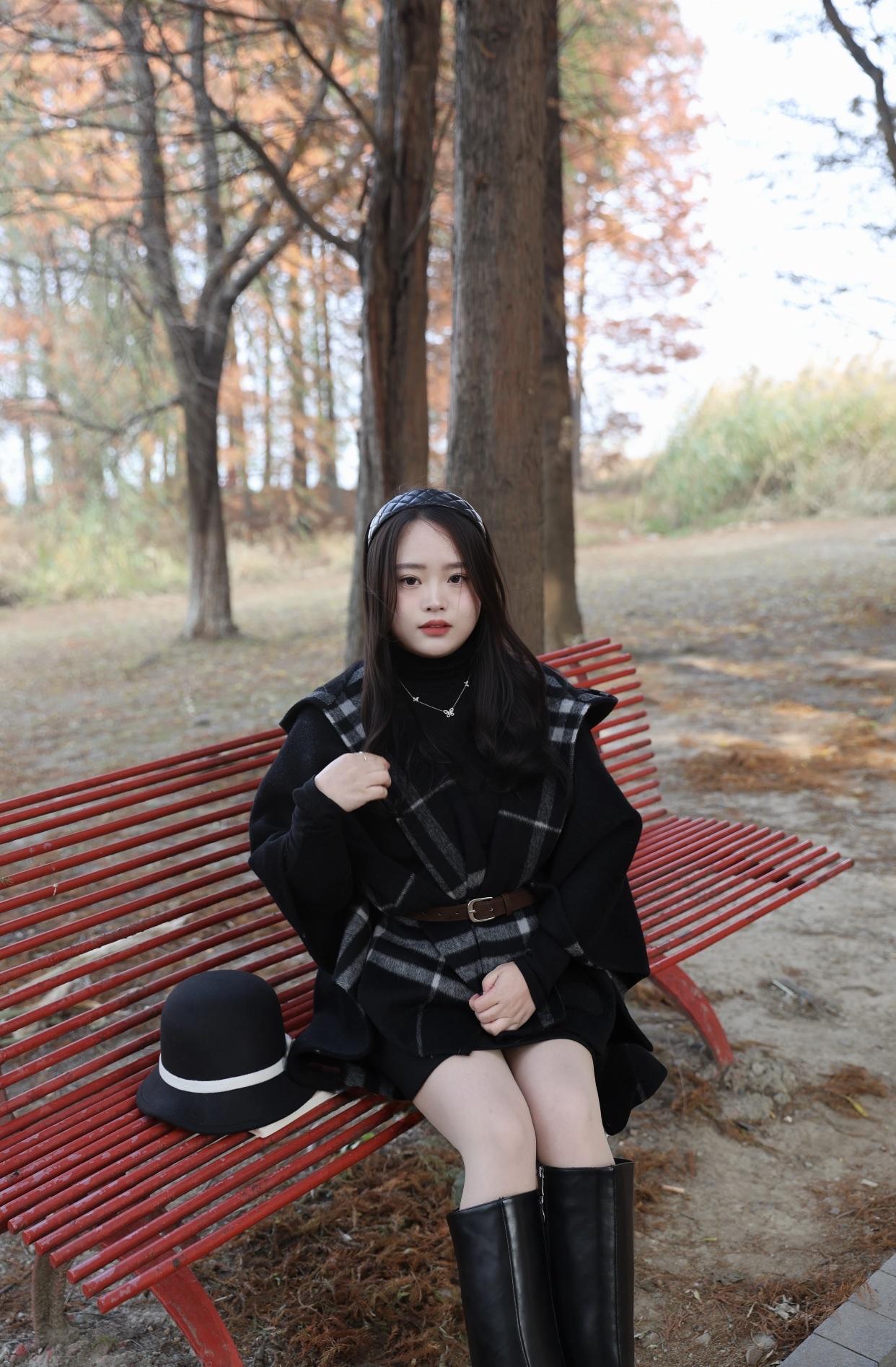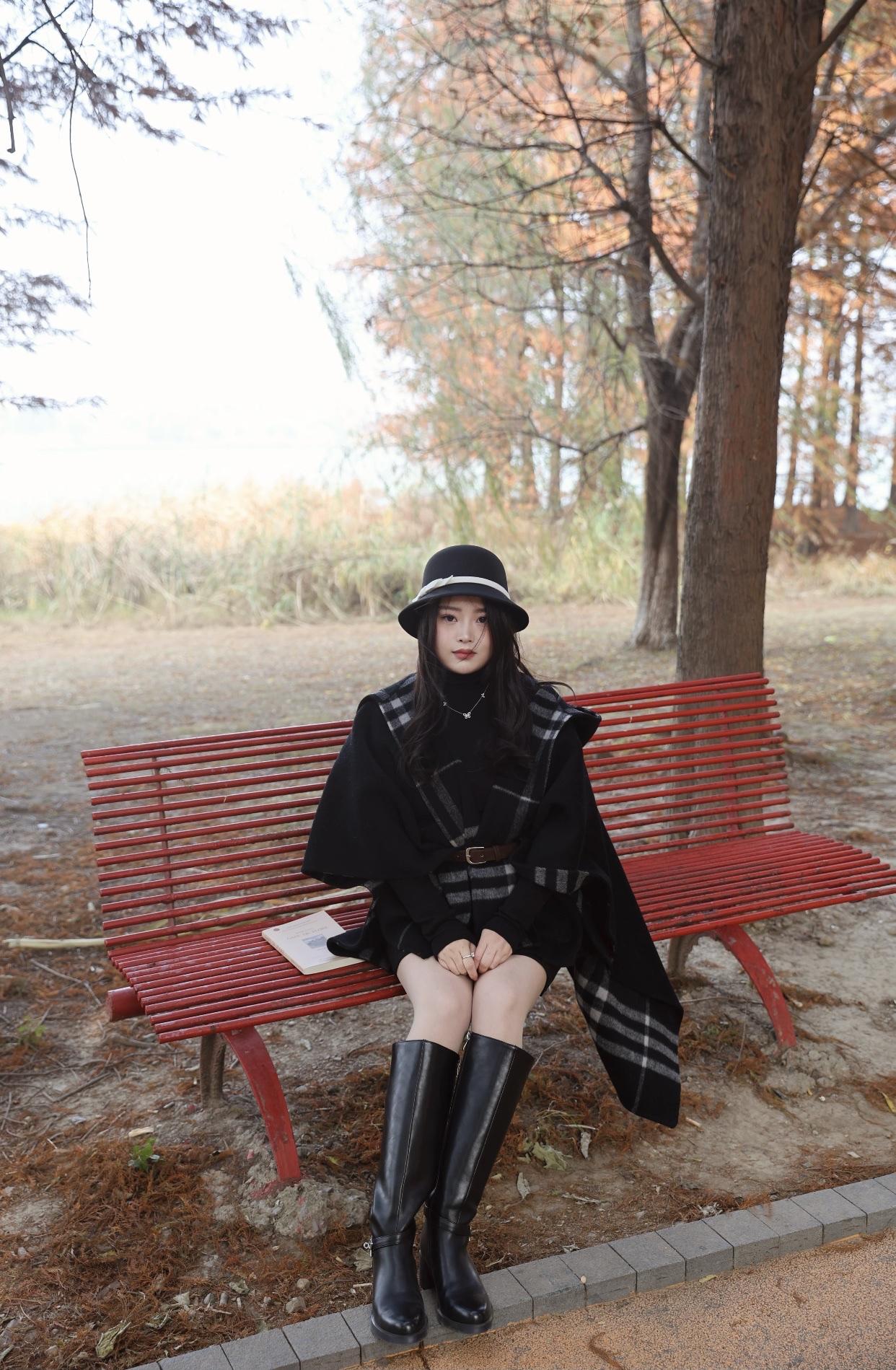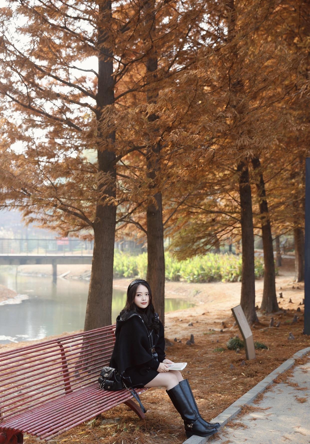 秋日公园长椅上,黑衣女子静坐,书香与自然相伴。公园淑女照