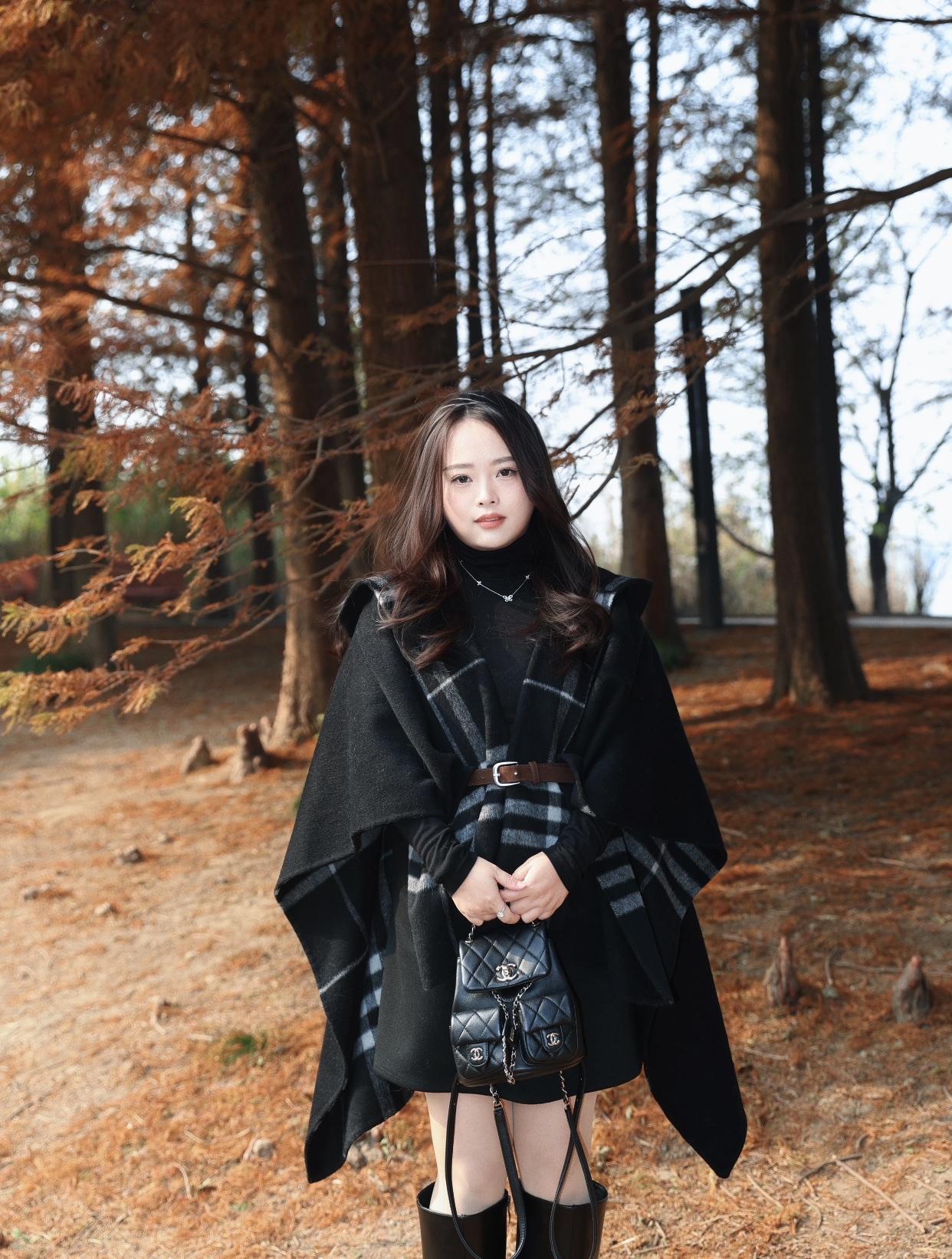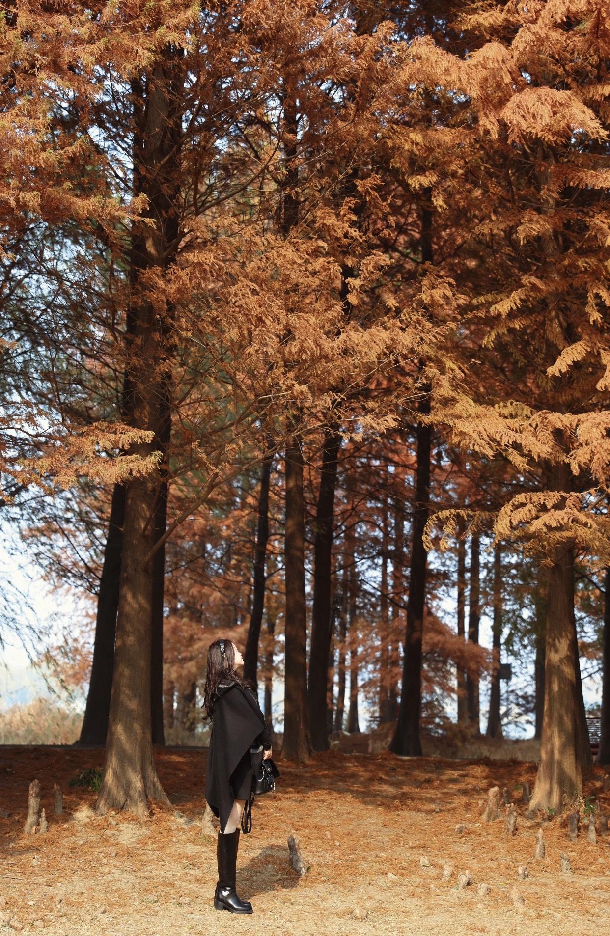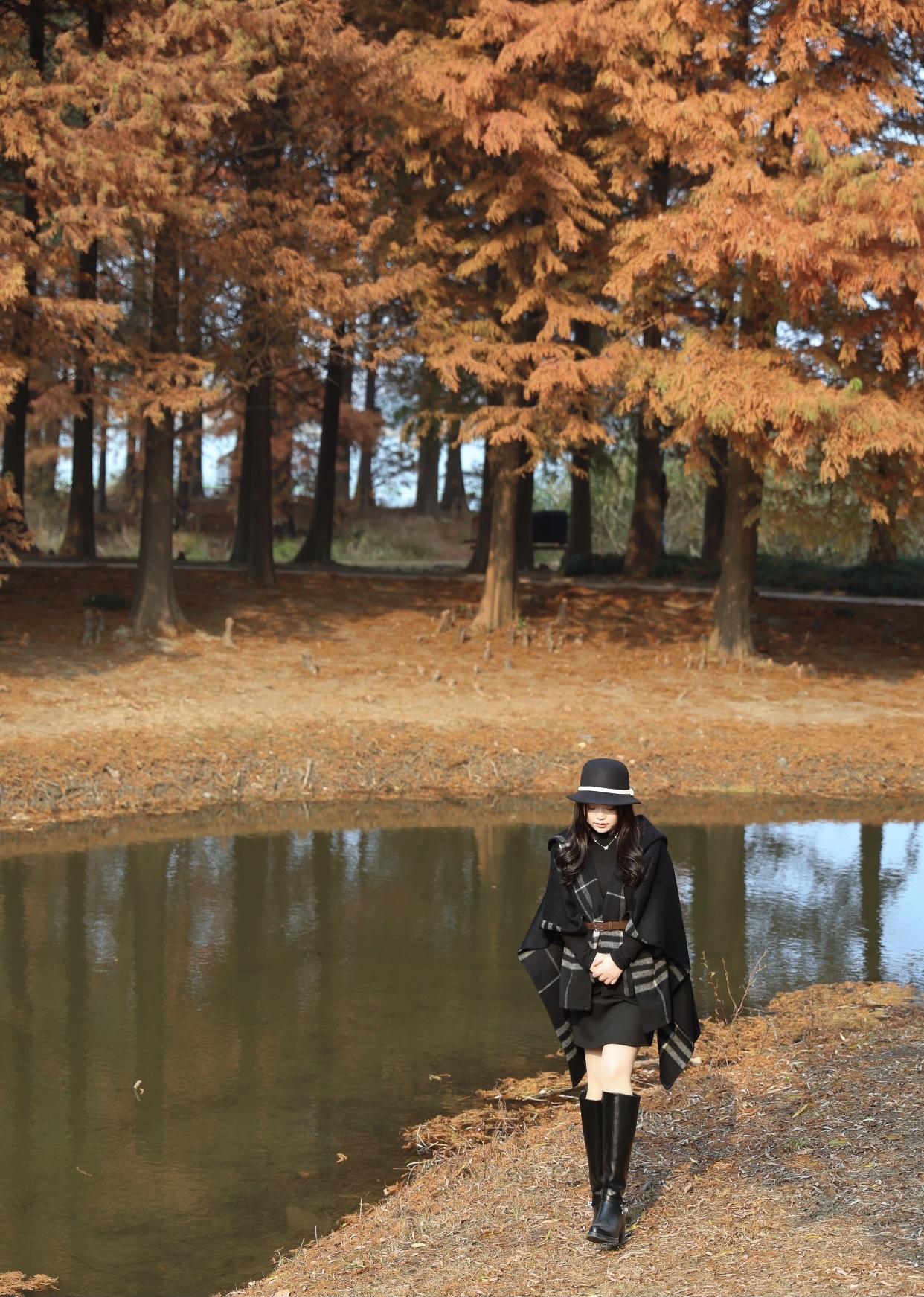 秋日公园长椅上,黑衣女子静坐,书香与自然相伴。公园淑女照