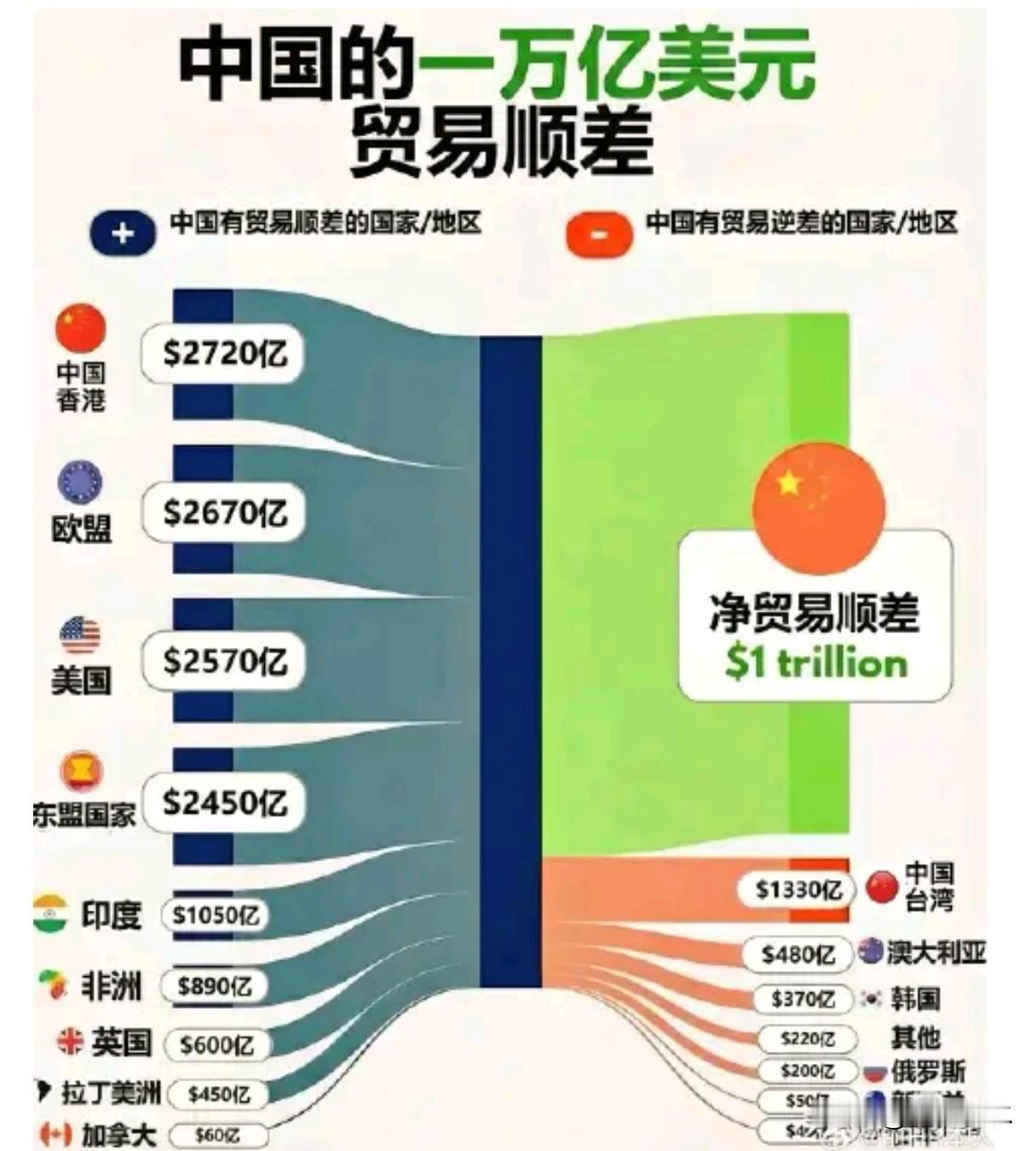 以前中国顺差全靠美国,现在不一样了!顺差来源广了,美国占比只剩1/4(加转口不到1/3),咱产业链捏得牢,美国说话不算数了。 赚钱路子多了,产业链控制力强了,美国影响力弱了。但对日韩还是逆差,得加大竞争——尤其半导体要替代日韩湾湾产业链,这是后续关键。 中国经济早不是“单腿走路”!顺差结构变了,说明咱底气足、自主性强——不靠谁脸色,照样赚世界的钱!