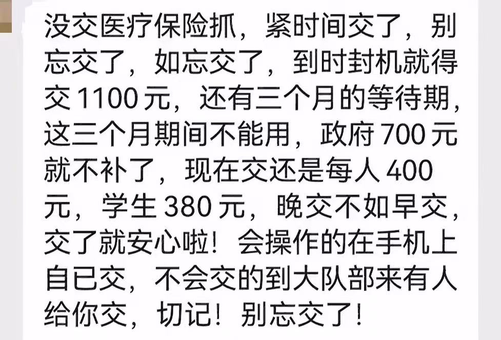 刚在老家的村民群里看到,村干部又开始苦口婆心地劝大家交医保了。