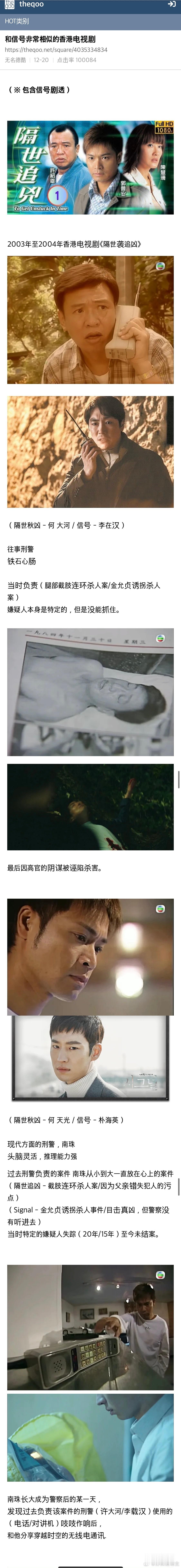 【热帖】和信号非常相似的香港电视剧03年至04年的香港电视剧《隔世追凶》因为赵震雄事件开始扒信号的抄袭争议。原帖评论已经破千,然后tq已经开扒有抄袭争议的韩剧了,目前信号编剧金恩熙还没有回应。hgr都很震惊…这反射弧有点长啊