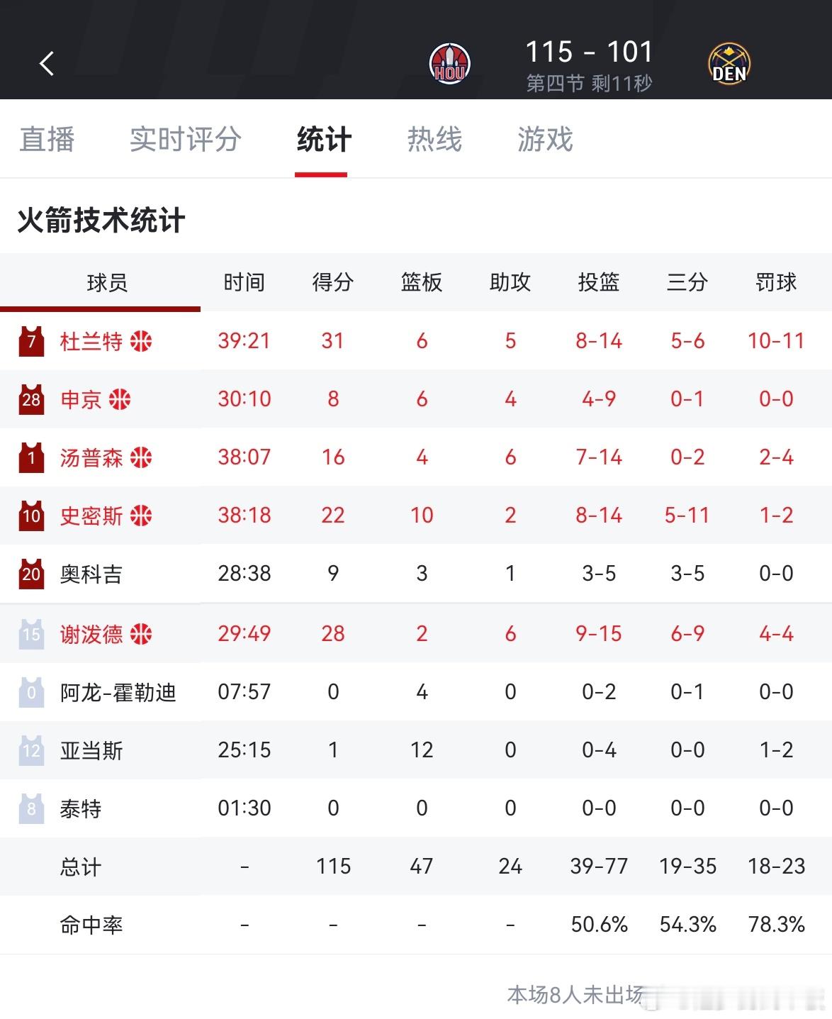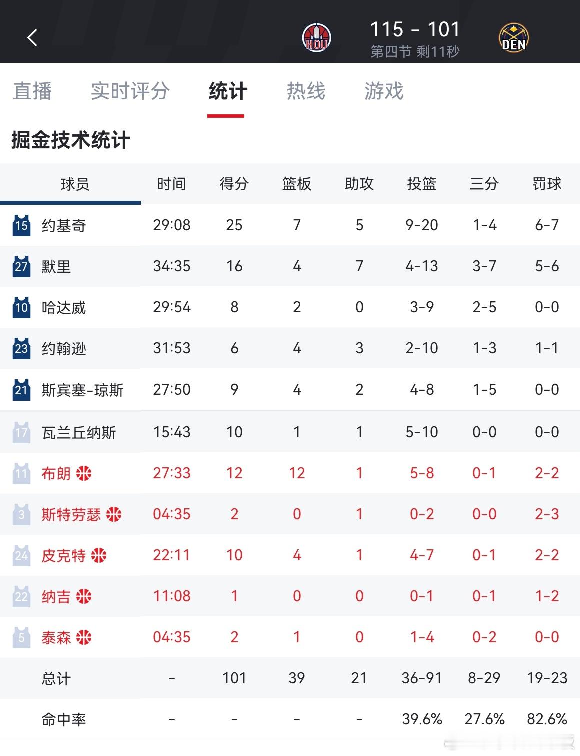 火箭115-101战胜掘金,终结掘金6连胜杜兰特31分,谢泼德28分,约基奇25分7板5助,穆雷13中4得到16分火箭vs掘金