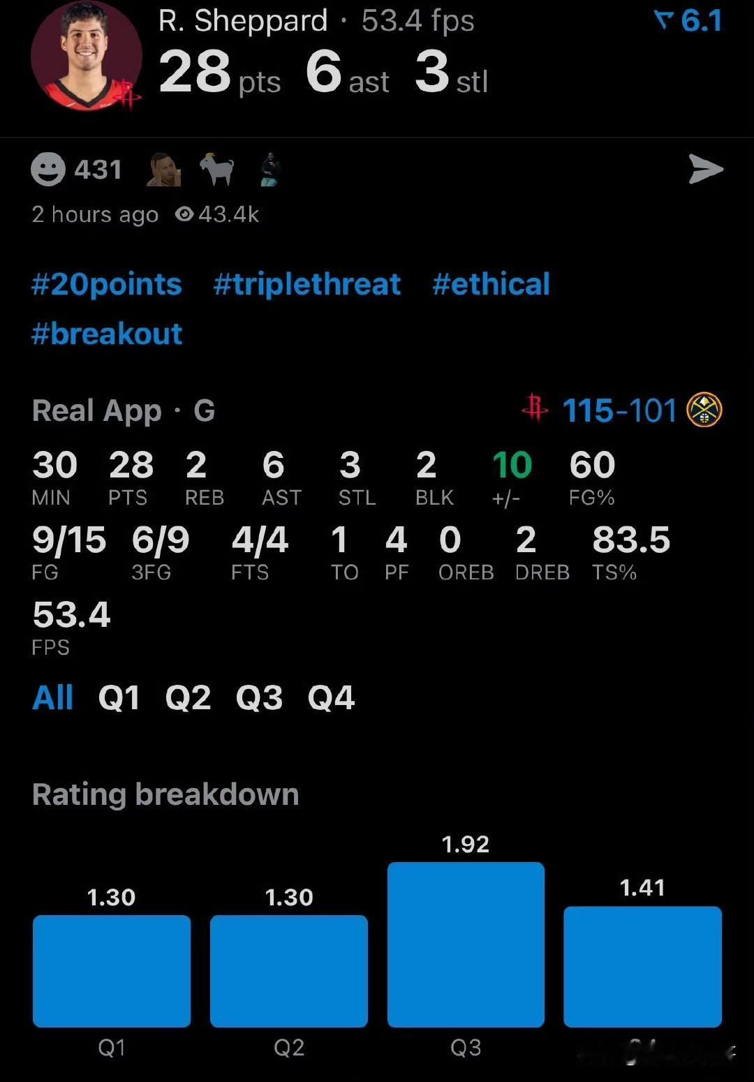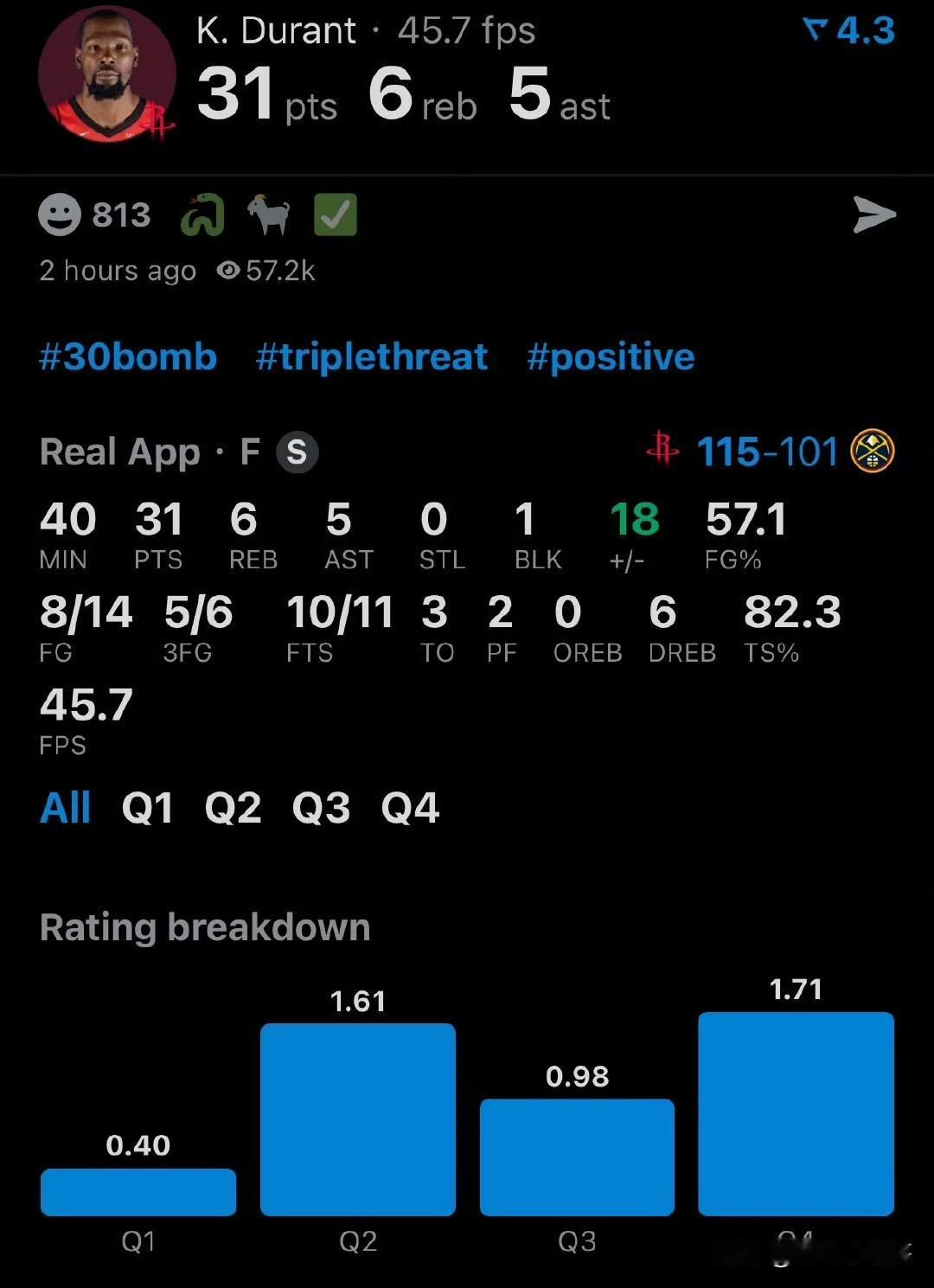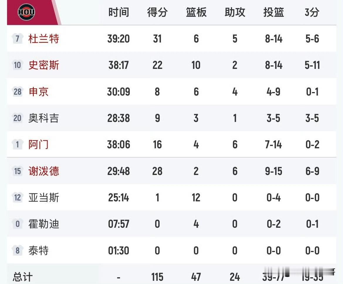 火箭复仇掘金!!!杜兰特31+6+5,谢泼德28分,火箭终结掘金6连胜! 在今天早些时候结束的一场比赛,火箭客场115-101大胜掘金队,在客场完成了复仇,上一场双方对决掘金艰难取胜,不过赛后裁判报告显示火箭吃亏了,今天双方再次对决肯定也是带着怨气必须拿下对方。 本场比赛,火命中率还是不错的,77中39,超过了五成,再看看掘金92中37,比火箭多出手了近20次,但是命中率却差了很多。 杜兰特再次高效砍下31分,投篮14中8,三分6中5,阿杜近期的手感可以说是相当出色了。 谢泼德本场比赛也是展现了射手本色,15中9,三分9中6,这才是他这个选秀顺位应该有的水平。 掘金6连胜被终结了,今天掘金整体手感不在线,就连约老师和穆雷双核都迷失了,这样他们输球也就没什么可说的了,火箭也是顺利复仇。 火箭 掘金 杜兰特 约基奇