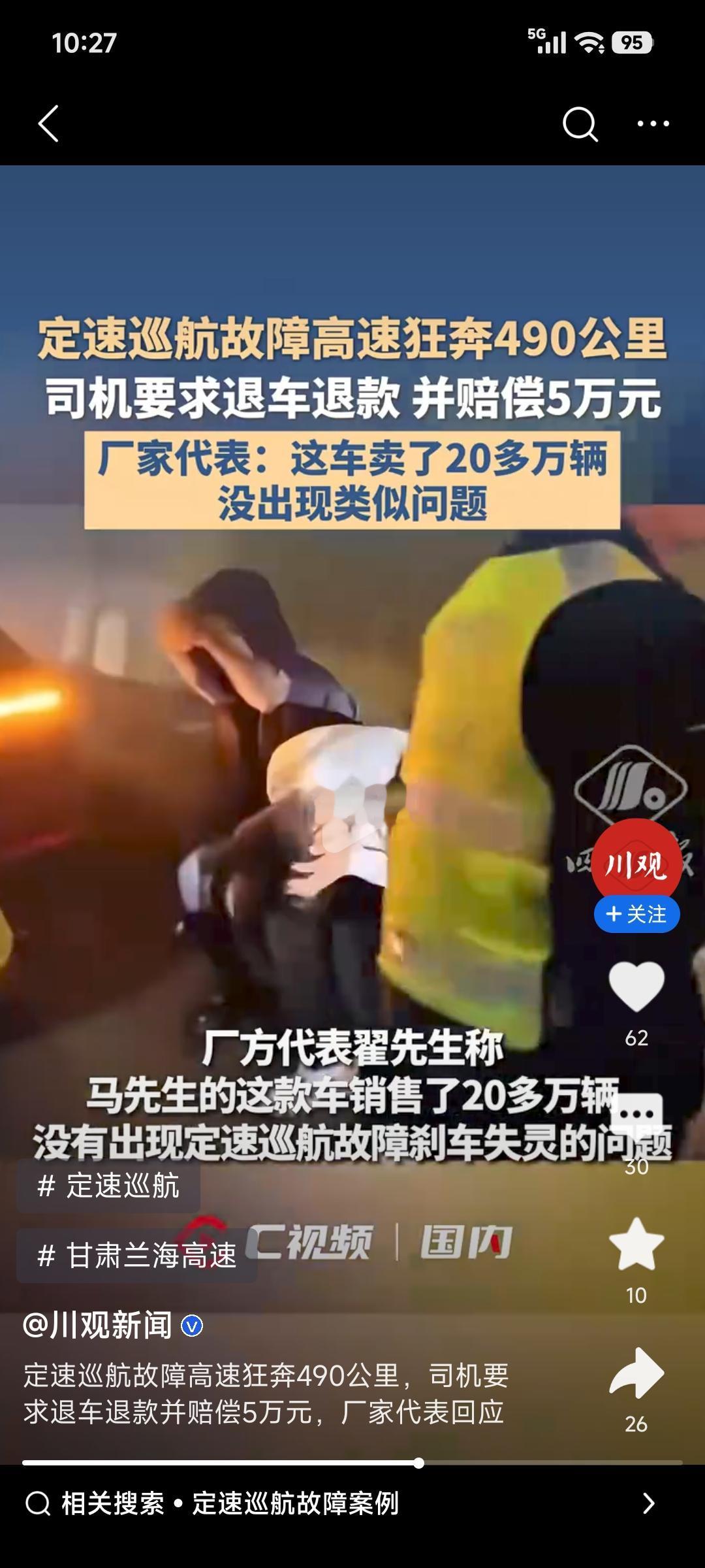 12月17日兰海高速上这事儿真够惊险的。23岁驾龄4年的马先生,开着甘A牌小轿车从兰州南上高速回临夏康乐。他定速115公里每小时,结果定速巡航故障刹车失灵,根本没法减速。车上还有吓个半死的女性朋友,他只能赶紧报警又联系4S店,可技师教的办法都不管用。 这车就这么以115公里时速狂奔490公里,得亏交警开道、路政压阵,直到燃油耗尽才化险为夷。这4个半小时马先生高度紧张,搁谁都受不了。现在他在4S店协商,要求退车退款还索赔5万精神损失费,换我也得这么做,谁遇到这事儿不得心有余悸啊。