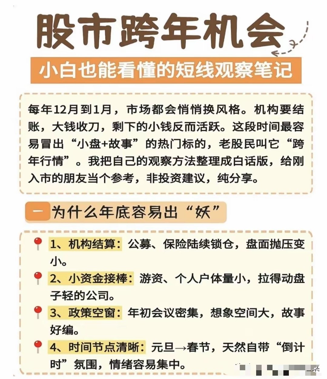 跨年行情藏机会,小白也能抓的短线密码每年12月到次年1月的A股跨年行情,向来是小资金的“表演时间”。机构结算锁仓让盘面抛压大减,游资和散户资金接棒,“小盘+故事”的标的更容易走出亮眼走势,这也成了老股民口中的跨年机会。想踩准这波节奏,选对标的是关键。自由流通市值15-40亿、日成交额放大2倍以上、近5日换手超60%且单日换手15%-30%,这四个硬条件是筛选基础;单标签清晰、有短期催化、图形干净、股东结构清爽的标的,更值得纳入观察池。操作上也得守纪律:破5日线加高换手先减仓,立春前务必轻仓,别把短线做成长线。小白更要记住,先用模拟盘练手,拿总资金5%以内小仓位试错,不借钱炒股,还要记录每笔交易并每周复盘。跨年行情虽有机会,但短线波动大,避开听消息追高、忽视监管等误区,才能在这场资金博弈里站稳脚跟。股票a股