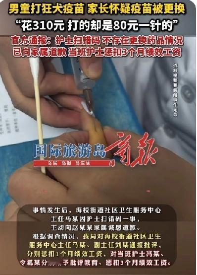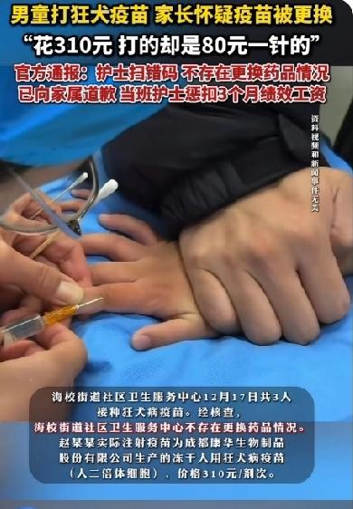 官方通报桐梓疫苗事件,男童打狂犬疫苗花310元打的却是80元一针的便宜药!官方称是扫错码,非换药!护士被罚三月绩效 2025年12月17日下午,贵州桐梓县居民赵某某因被狗咬伤,前往海校街道社区卫生服务中心就诊。考虑到疫苗的安全性和效果,家属选择了价格310元/剂次的成都康华生物制品股份有限公司生产的冻干人用狂犬病疫苗(人二倍体细胞),并按要求完成缴费领药流程。然而,在接种结束签字确认时,家属意外发现屏幕显示的疫苗信息与所选疫苗不符,竟是单价80元的山东亦度生物技术有限公司生产的冻干人用狂犬病疫苗(Vero细胞)。 这一明显的价格与信息落差让家属陷入焦虑,担忧孩子接种的疫苗被私自更换,“花高价却打便宜疫苗,万一预防效果不足,感染风险谁来承担?”12月18日,家属将相关情况通过网络反映,引发了网友的广泛关注,“医院是否存在偷换药品牟利”的质疑声迅速蔓延。 事件发酵后,桐梓县卫生健康局第一时间介入,联合县疾控中心展开全面调查。原来12月17日该中心共有3人接种狂犬病疫苗,而且前两位接种的是80元/剂次的疫苗,而只有赵某某接种的是310元的疫苗,事实证明310元的疫苗库存也确实是减少了,不存在药品替换情况。问题就出在当班护士在录入疫苗追溯码时,误将前一接种对象使用过的80元疫苗包装盒扫码录入系统,导致信息记录与实际接种疫苗不一致。 对此官方通报对当班护士给予批评教育并惩扣3个月绩效工资,对中心主任、副主任予以通报批评并各惩扣1个月绩效工资,后续将从严规范全县医疗机构内部管理。 因为工作中的粗心大意就闹出了这么大的乌龙事件,这说明工作人员缺乏严谨的工作态度和必要的责任心。仅仅惩扣绩效工资,能让他们真正吸取教训吗?医院应该以此为契机,加强对医护人员的专业培训,尤其是在疫苗接种这种关乎生命健康的重要环节,要制定更严格、更细致的操作规范和审核流程。毕竟医务工作者肩上的责任相当重大,这不只是他们的工作,更是公众把生命托付给他们的信任!