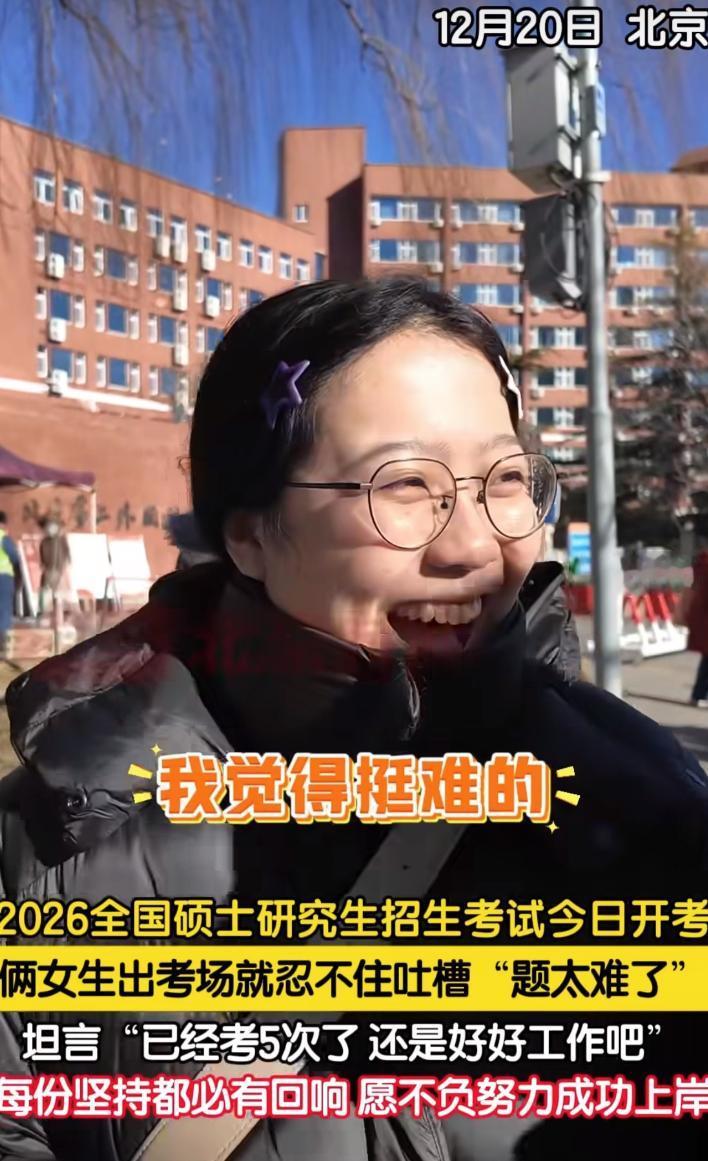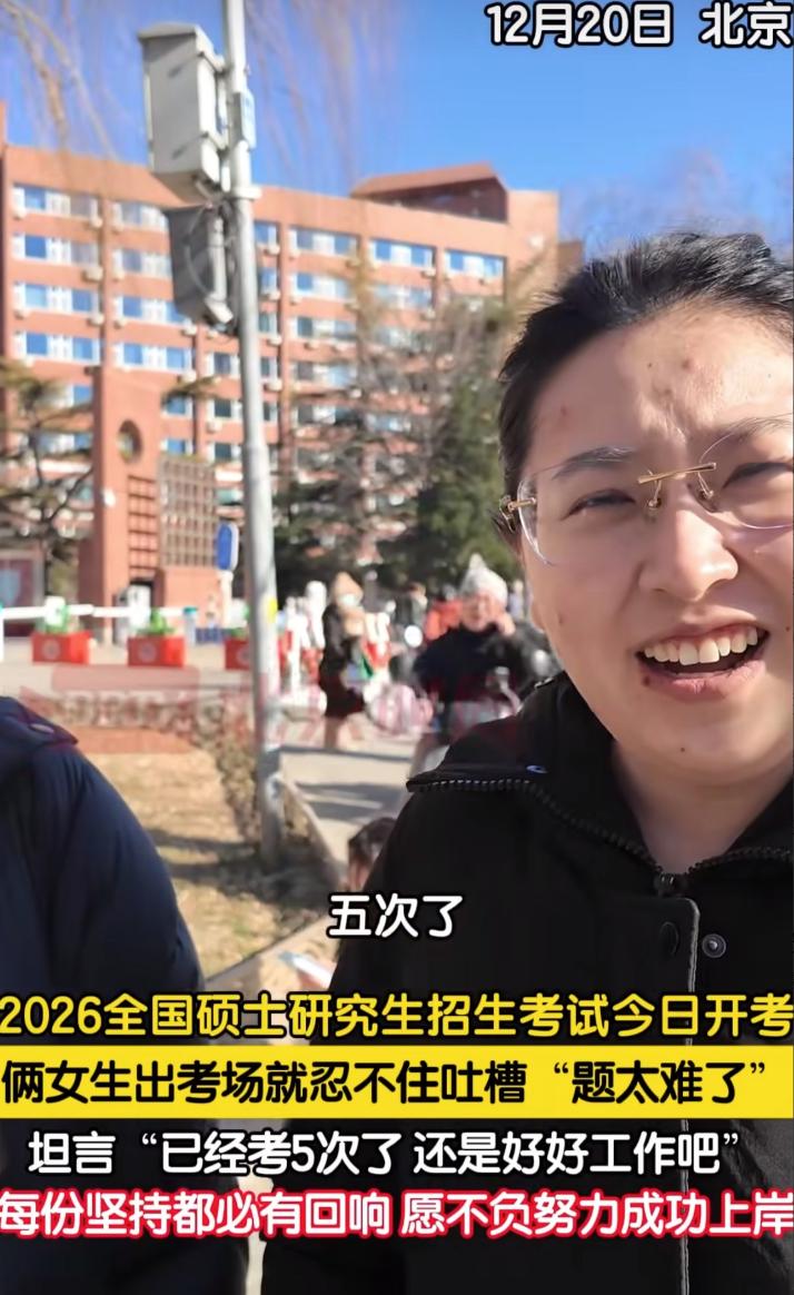 “扎心了!”北京,一考研考点外,两名女生在考完试后接受采访,被问到试题难不难时,女生回答:好多不会啊!考了五次了,不考了,还是好好工作吧!网友:早就该这样想了 能看得出来,面对镜头时,两人心情还算不错,虽然觉得题目不简单,但回答的时候还是面带笑容,说好多题都不会做,觉得试卷还是挺有难度的,可当提到这已经是自己第五次走进考场,两人脸上的笑容慢慢淡了下去。其中一个摇摇头说,不考了,回头好好工作吧 很多人爱说早就该这样想了,好好工作更现实。这话站在旁观者角度,确实轻松。真放到自己身上,未必说得出口 考研从来不只是一张文凭,它更像一条被反复验证的路。你不是真的非要那个结果,你是想证明自己还有机会再往上走一步。考到第五次,说明她们并不懒,也不是没坚持过,恰恰相反,是太认真了 她们没有怨天尤人,也没把失败说得多悲壮。接受考得不好,承认不想再继续,这本身就是一种成熟。很多人卡住的,并不是没能力,而是不甘心停下来。真正难的不是继续考,而是承认这条路到这儿了 在我看来,选择停下不是失败,是换赛道。工作不是退而求其次,是另一种把时间变现的方式。越早进入现实场景,越容易知道自己到底适合什么。考研这条路,对有明确目标的人有价值,对已经反复尝试却始终没有反馈的人来说,及时止损反而更重要。人生不是只有一张答卷,考场之外,才是更长的考试