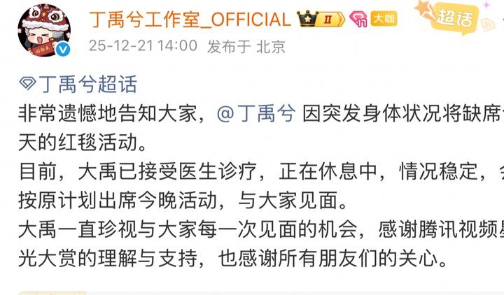 丁禹兮将缺席星光大赏红毯丁禹兮因身体状况缺席星光大赏红毯