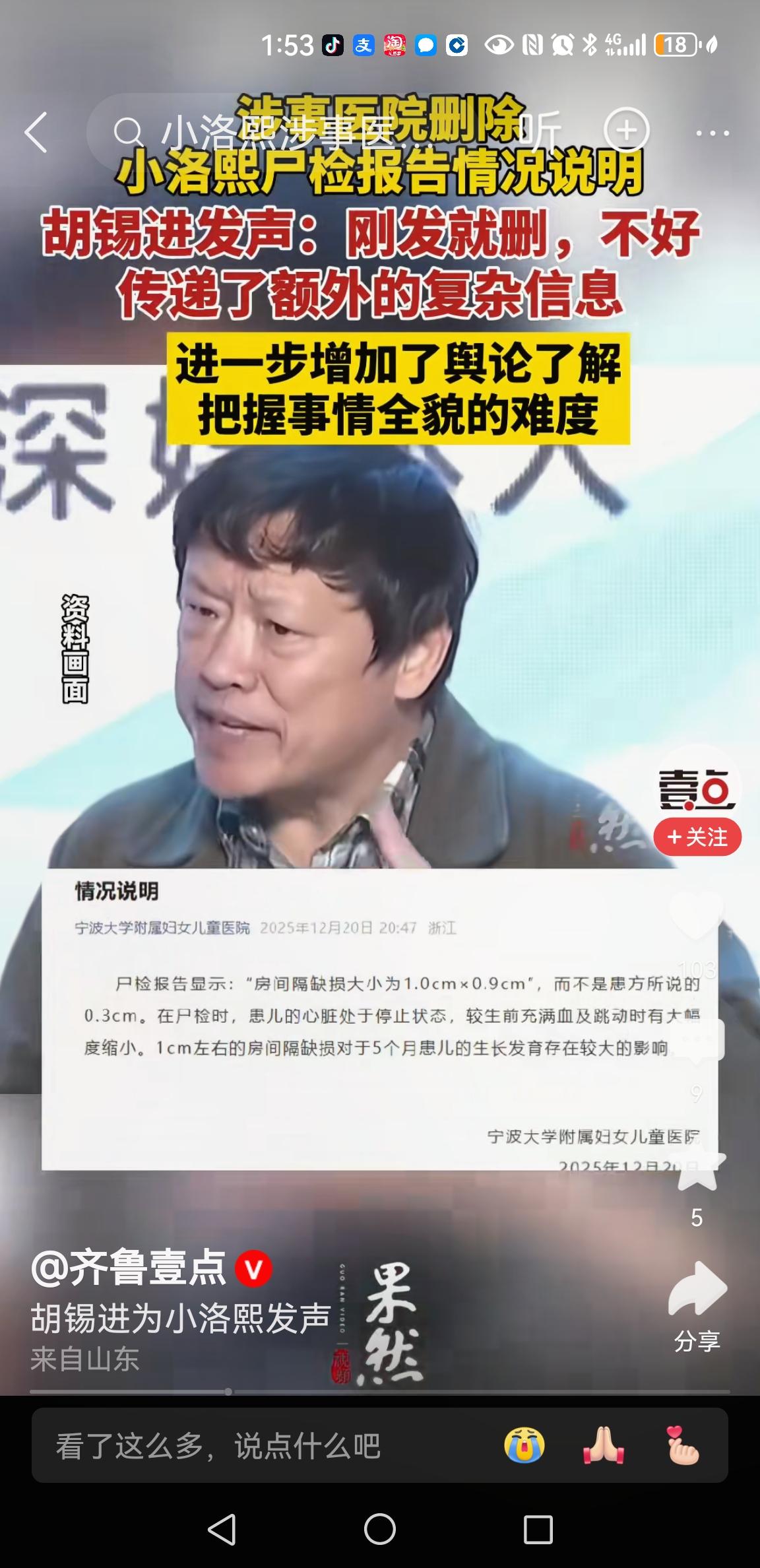 涉事医院秒删尸检报告,胡锡进发声! 昨天,小洛熙涉事医院发布小洛熙尸检报告情况说明,但是很快就删除了。 胡锡进发声:“刚发就删,不好!传递了额外的复杂信息” 是呀,网友们都想问: 涉事医院为什么要删除已经公开的尸检信息? 为什么官方公布的房缺数据和患者家属公布的不一样? 医院秒删尸检报告,是发布信息有误,还是想自己网暴自己? 你想删就删,可是不要忘记,互联网是有记忆的! 两个数据的差异背后,拉大了公众对医院的“信任”差距! 不要让小洛熙的尸检报告,成为“二次伤害”。 洛熙的妈妈心在滴血,快要疯了!