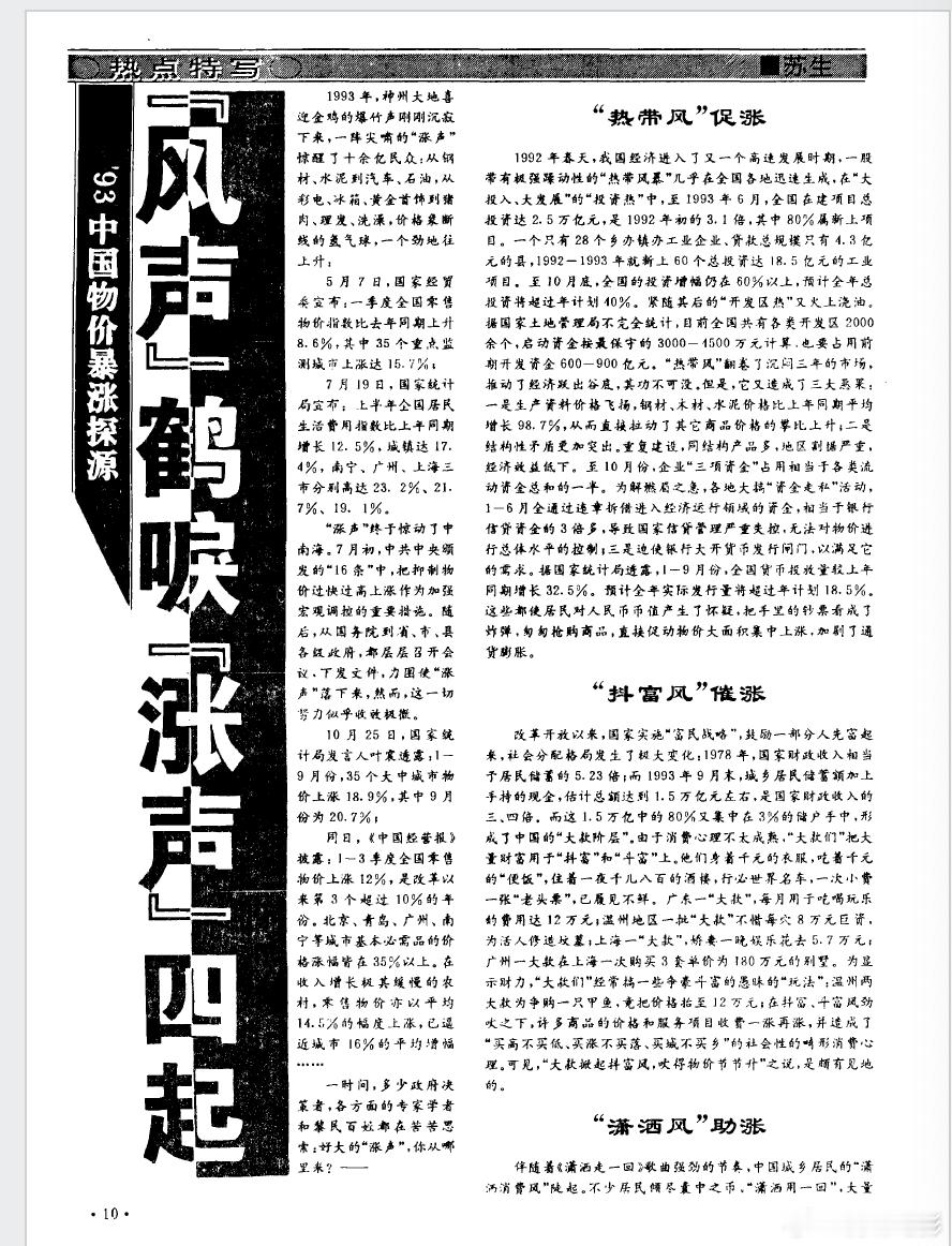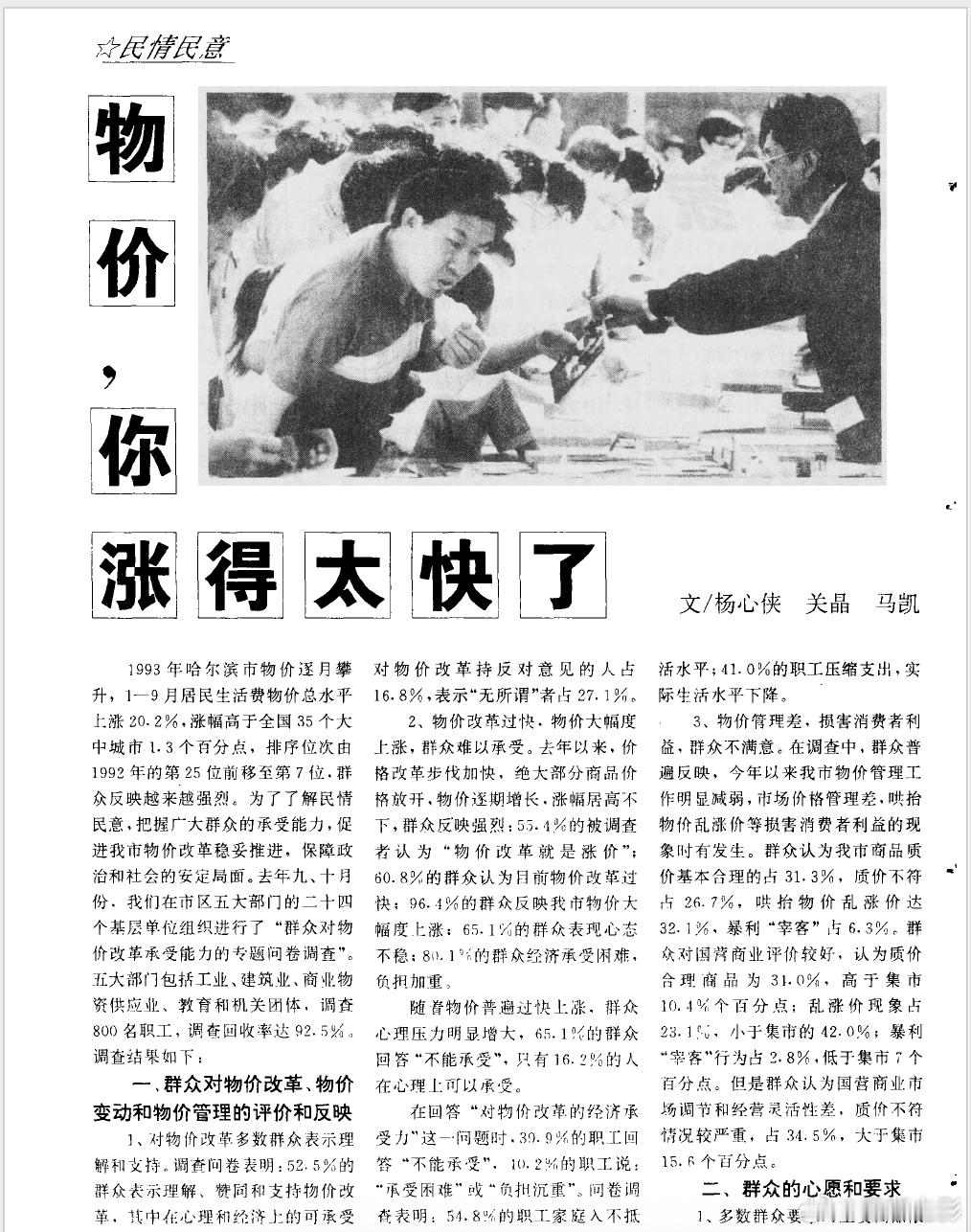 电视剧老舅看了几集郭京飞的新剧《老舅》,很多弹幕都在吐槽电视剧中的物价太高,或许因为太多观众对当时的经济状况不太熟悉。故事从1993年秋天开始,这一年,全国正经历着通货膨胀,而且是80年代以来的第三次,前两次分别是1985年、1988—1989年。1985到1995年这十年间,国家逐渐开放粮食购销价格、商品价格、生产资料价格,经济升温的同时,物价也不断上涨。到1992年,我国经济生活中出现了“四热”、“四高”、“四紧”、“一乱”的现象:“四热”,即开发区热、房地产热、股票热、集资热;“四高”,即高投资规模、高信贷投放、高货币发行、高物价上涨;“四紧”,即交通运输紧张、能源紧张、重要原材料紧张、资金紧张;“一乱”,即经济秩序混乱,尤其是金融秩序混乱。以黑龙江为例,1990年到1996年之间,居民消费价格总水平计上涨1.16倍,年平均上涨11.6%,期间的1993—1995年物价涨幅均在两位数以上,同比分别上涨14.8%、21.9%、16.1%,达到改革开放以来的最高水平。其中,1994年黑龙江居民消费价格总水平上涨21.9%,成为改革开放40年来的最高涨幅。以当时的“石狮娱乐城”价目表为例,可口可乐6元、百事可乐10元、万宝路12元、红塔山20元。看看当时的新闻报道《93年中国物价暴涨探源——“风声”鹤唳 “涨声”四起》《物价,你涨得太快了》,都在讨论当时的社会现象。