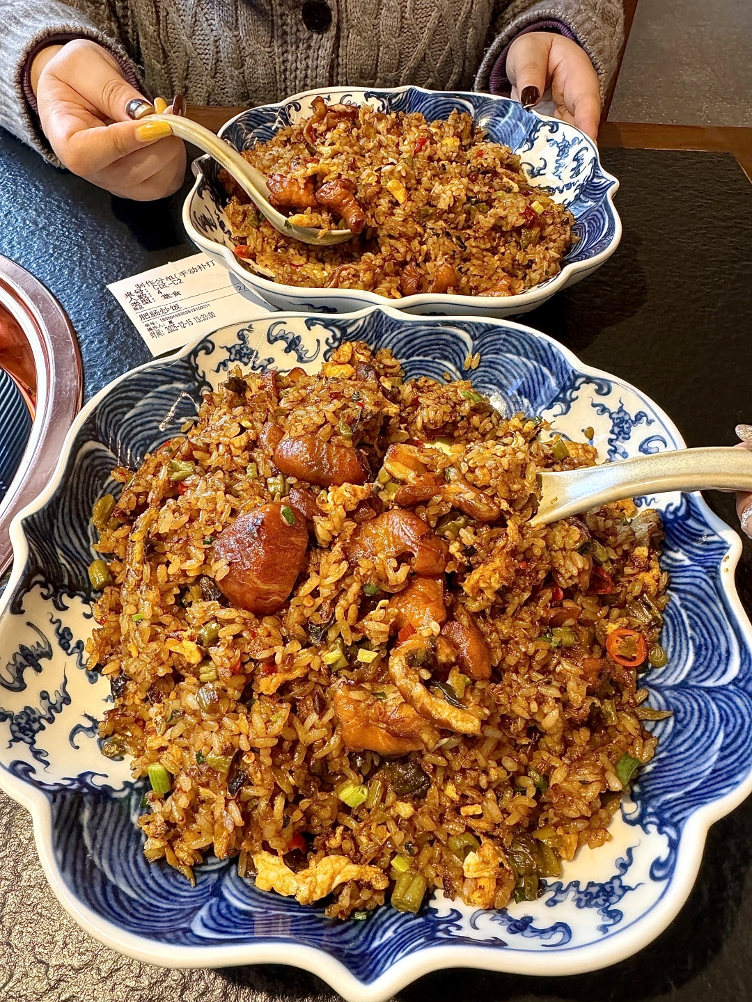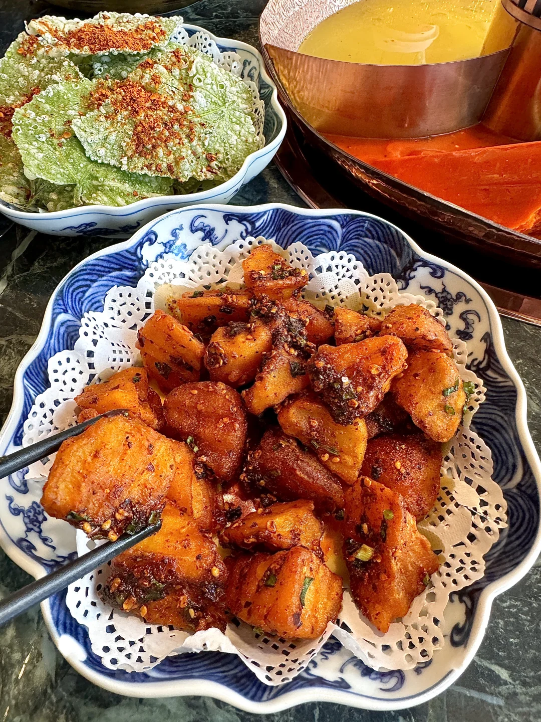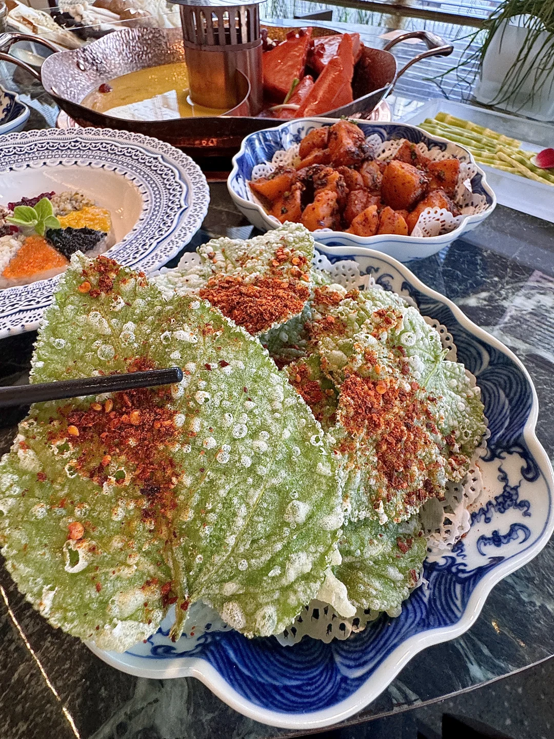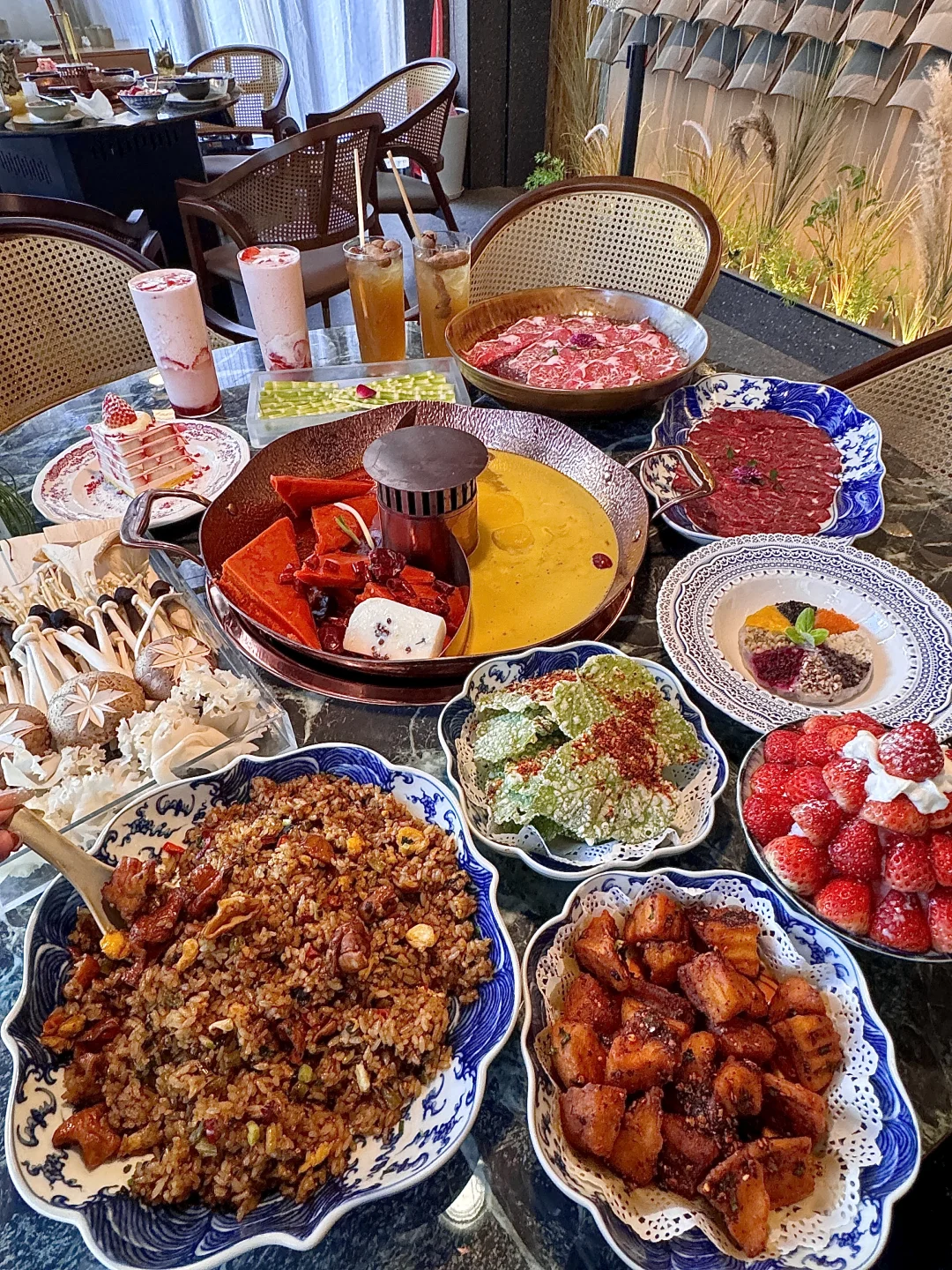 肥肠炒饭、炸桑叶、锅巴土豆🥔、沙葱、爱马仕虾滑、菌菇拼盘、雪花牛肉……直接闭眼点,没有一个不好吃的~
