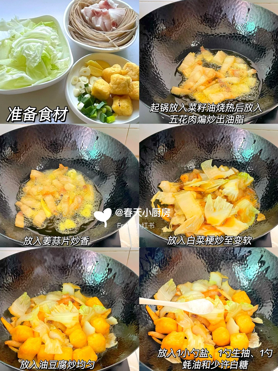 大白菜、油豆腐、红薯粉条、五花肉、姜片、蒜片、青蒜叶、盐、生抽、白糖、蚝油、清水、菜籽油。