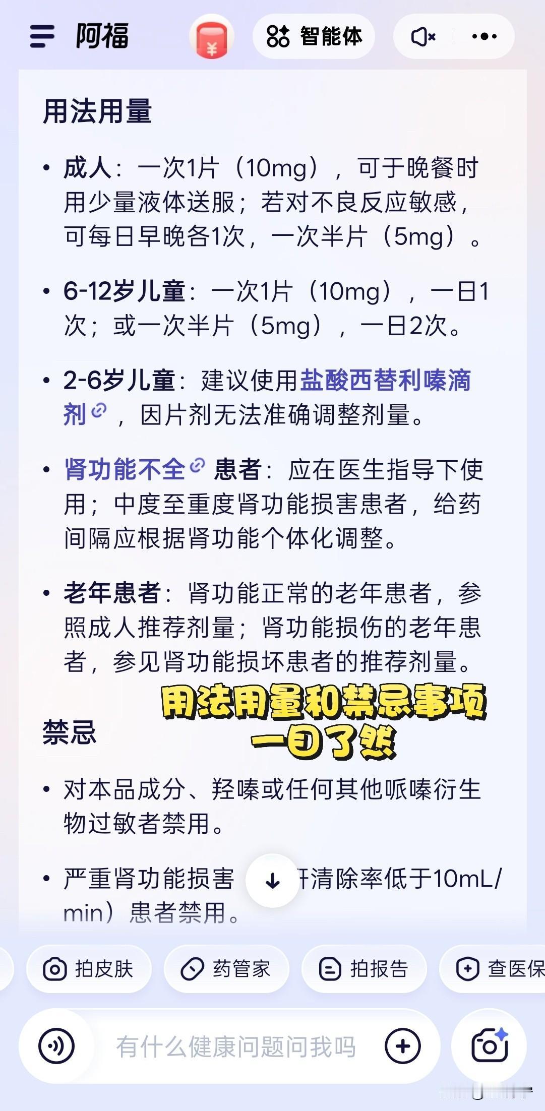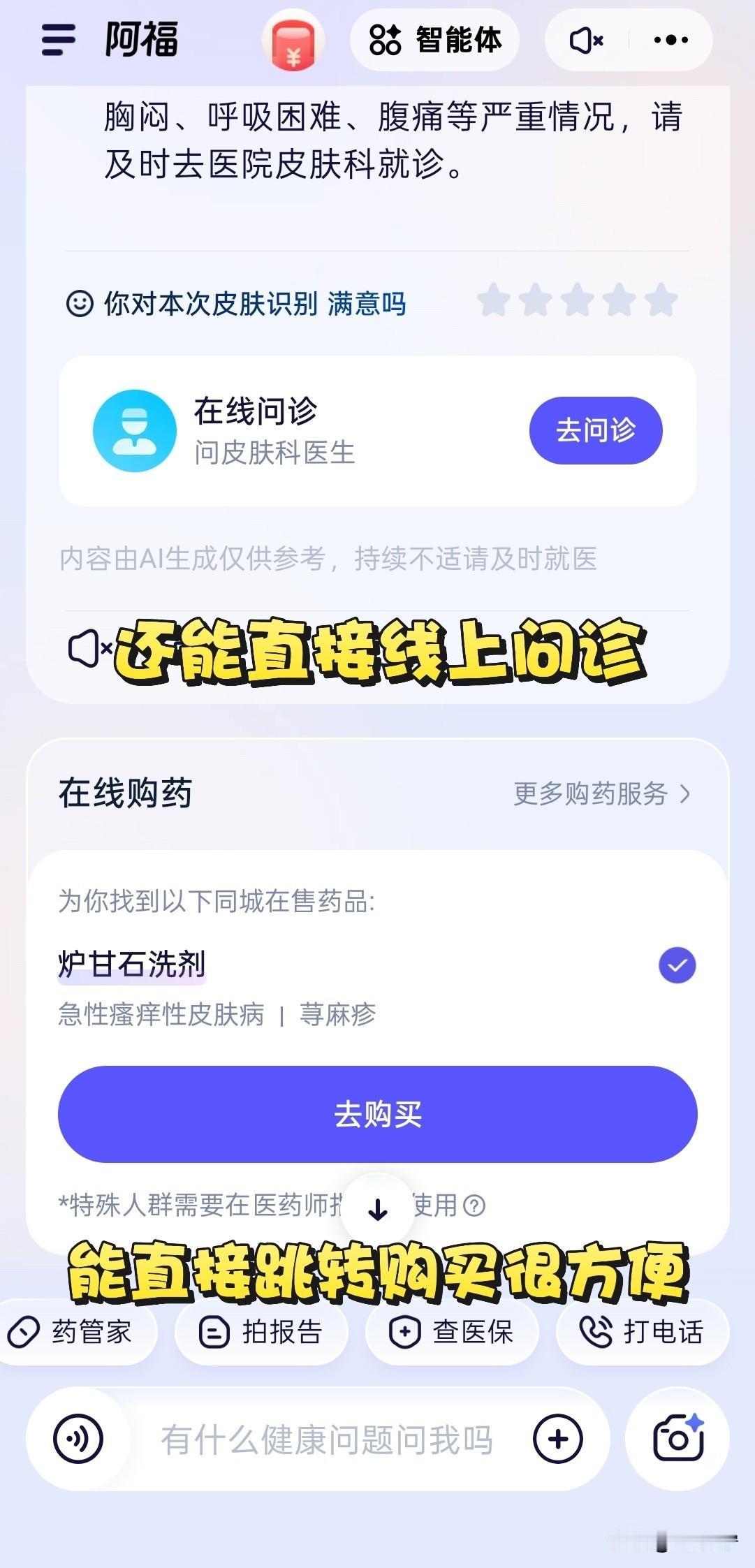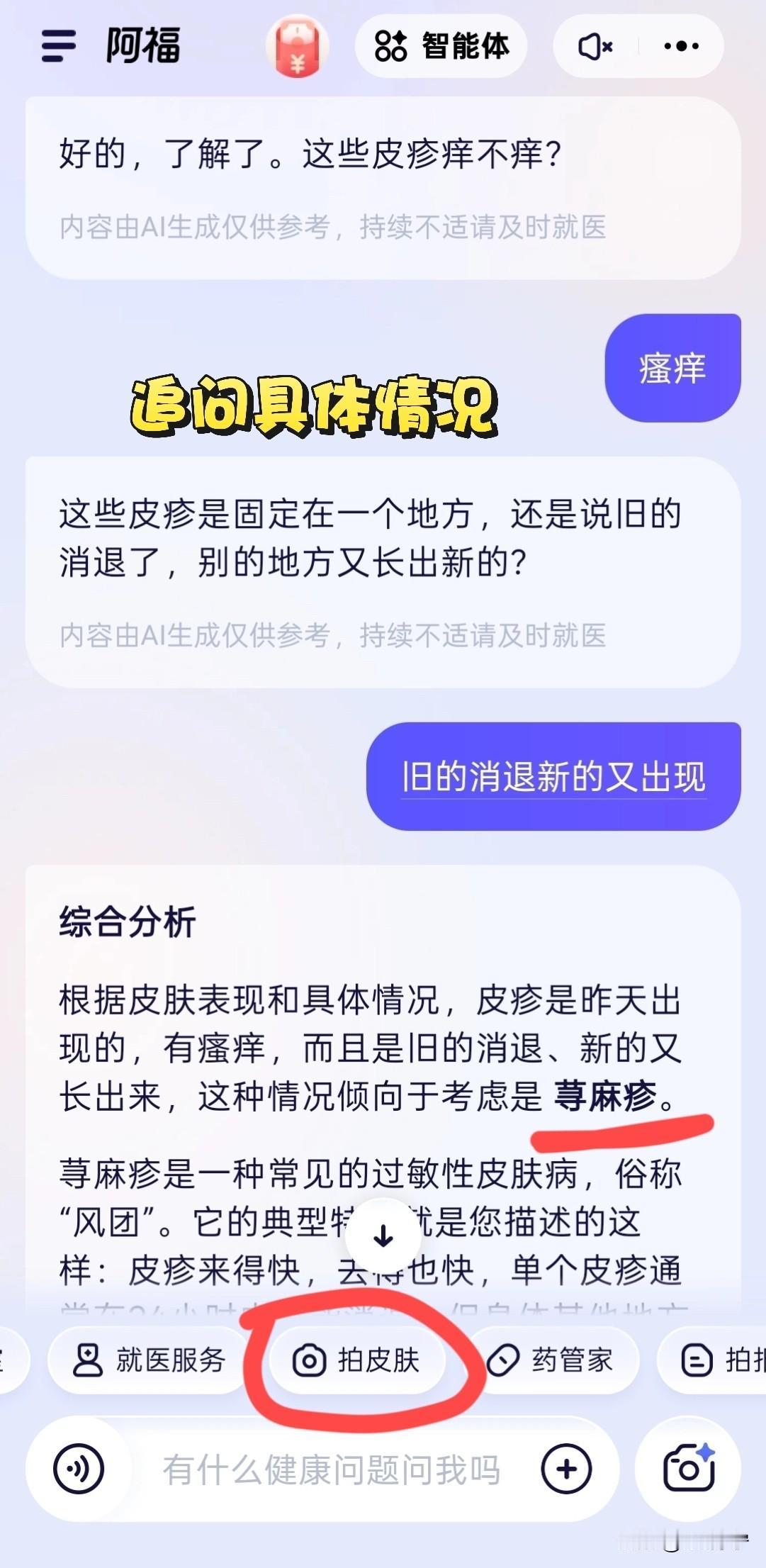 湿疹荨麻疹分不清?阿福帮你拍照识别 得过荨麻疹,才知道什么叫“痒得钻心”。我是过敏体质,经常出现皮肤类的问题,每次有点状况就往医院跑,实在折腾。后来跟朋友聊起这事,他推荐了我一个叫蚂蚁阿福的APP,说是最近很火的AI健康管理应用,可以智能识别皮肤问题,比自己在网上乱搜、到处问人靠谱多了。 比如我这种容易过敏的体质,碰到疑似荨麻疹的红疹时,就打开阿福里的 “拍皮肤” 功能,发给他后,能很快就能给出初步分析——火疖子、湿疹、荨麻疹、汗疱疹这些常见皮肤问题,它基本都能分辨出来。 然后继续追问细节:“出现多久了?”“痒不痒?” 像是一次耐心的线上问询。根据我的回答,它会综合给出护理建议,比如提醒避免搔抓、保持皮肤清凉、注意饮食等。 除了拍皮肤,我还发现了两个很实用的功能: 拍药盒这个特别适合家人。家里长辈常把药盒、说明书随手放丢,遇到不熟悉的药,只需用这个功能拍一下药盒,就能清晰看到用途、用法、禁忌和副作用,解释起来一目了然,他们用药也更安心。 体检报告或一些化验单上的专业术语看不懂时,也可以发给让阿福帮忙解读,它会用易懂的语言解释关键指标和注意事项,帮你初步理解身体信号。 平时小毛病不想动不动就跑医院,可以先用阿福初步排查一下,做到心里有数。当然,它只是辅助工具,严重或持续不适一定要及时线下就医。