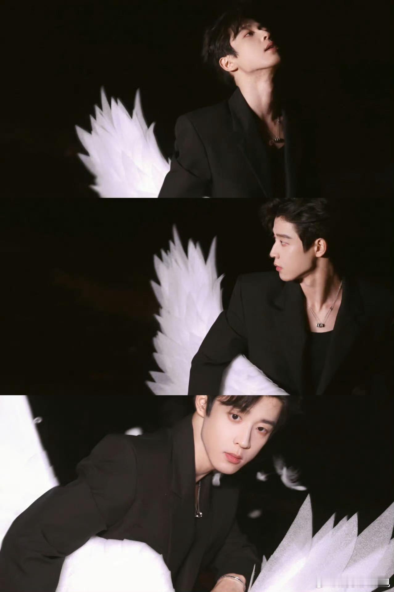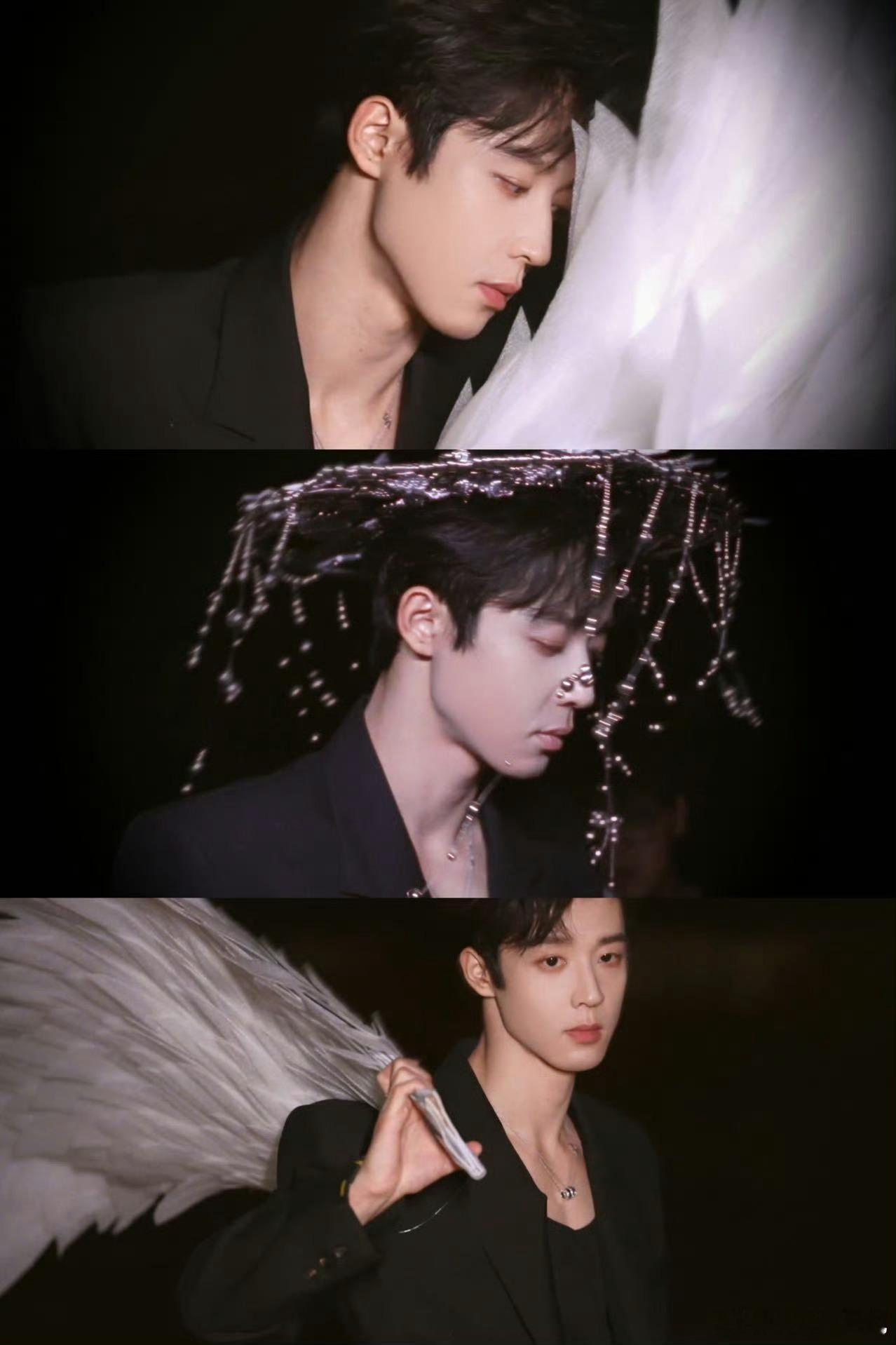 吴宇恒把AI建模参数交出来 这组影像的成功,在于将服饰转化为叙事符号。白色羽翼不再是单纯的装饰,而是纯洁与超脱的隐喻;黑色西装则锚定了现代与理性的基调。吴宇恒以自身为画布,完成了一场关于古典与当代、神性与人性的视觉思辨。