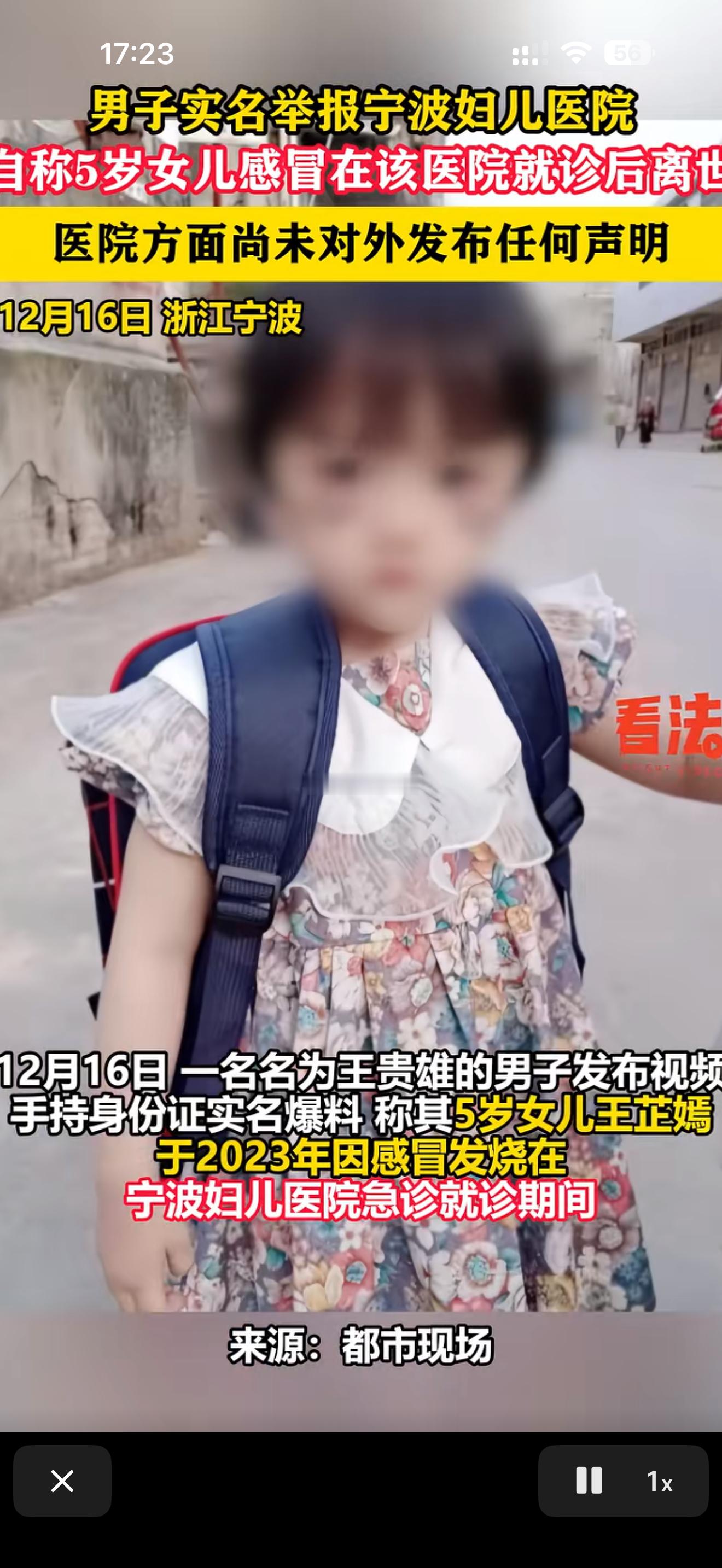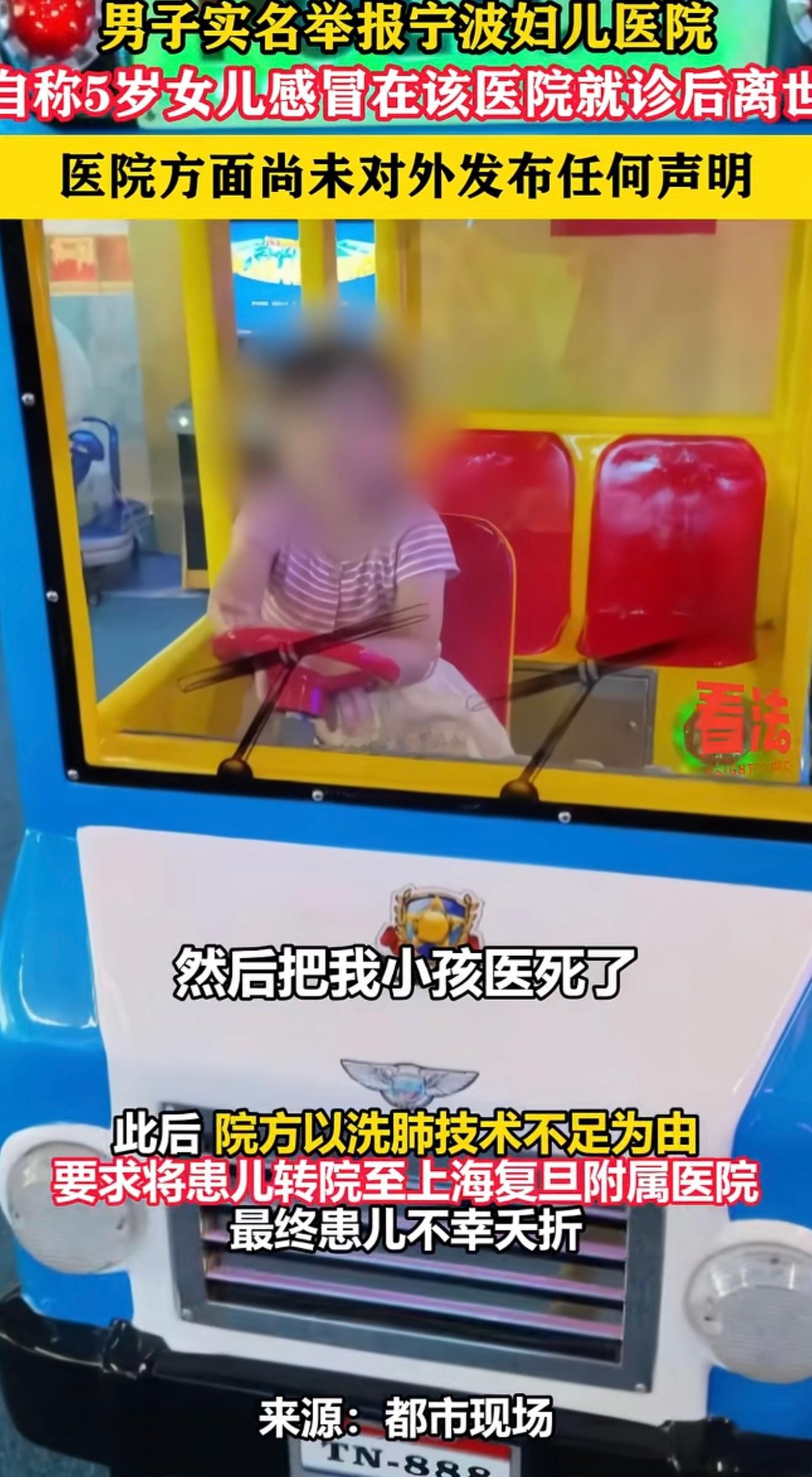 男子实名举报宁波妇儿医院,自称5岁女儿感冒在该医院就诊离世!