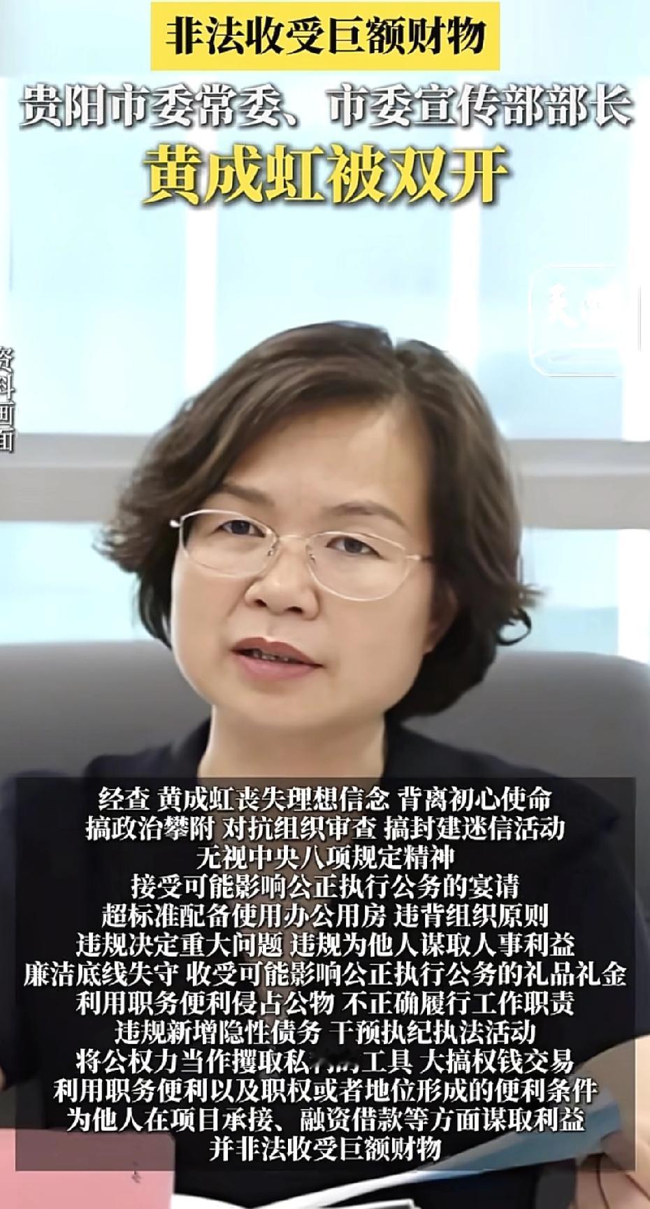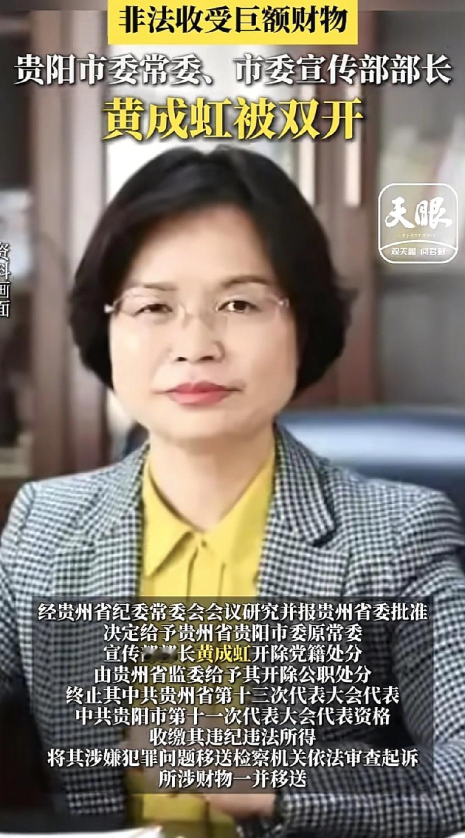 贵阳的黄成虹彻底栽了。 她的个子不高,平日里的穿着打扮,十分时尚,脸有点方方,戴着一副眼镜,看起来也是十分素雅,头发则剪成短发,烫着小卷,看起来也是风韵犹存。 她是1968年生人,今年57岁,土生土长的贵州兴仁人,拥有大学学历,关键还是法律硕士,曾经在贵阳市工作了长达30余年。 此前担任过贵阳市小河区司法局局长,招商局局长,小河区副区长。 于2020年晋升为南明区区长。一年之后,又晋升为南明区委书记。 2022年的时候,晋升为贵阳市人大常委会副主任,两年之后,又担任贵阳市委常委、宣传部部长。 可谓是位高权重。 贵阳市可是贵州省的省会,常住人口660.25万人的大城市。 能够在这样的大城市里面,有个铁饭碗,是多少莘莘学子们梦寐以求的工作。 然而她却不珍惜,在履职期间,非但没有恪尽职守,反而是廉洁底线失守,将公权力当作攫取私利的工具,大搞权钱交易。 如今东窗事发,水落石出,也预示着她的好日子将彻底终结,未来等待她的将是法律的审判和后半辈子的牢狱生活。