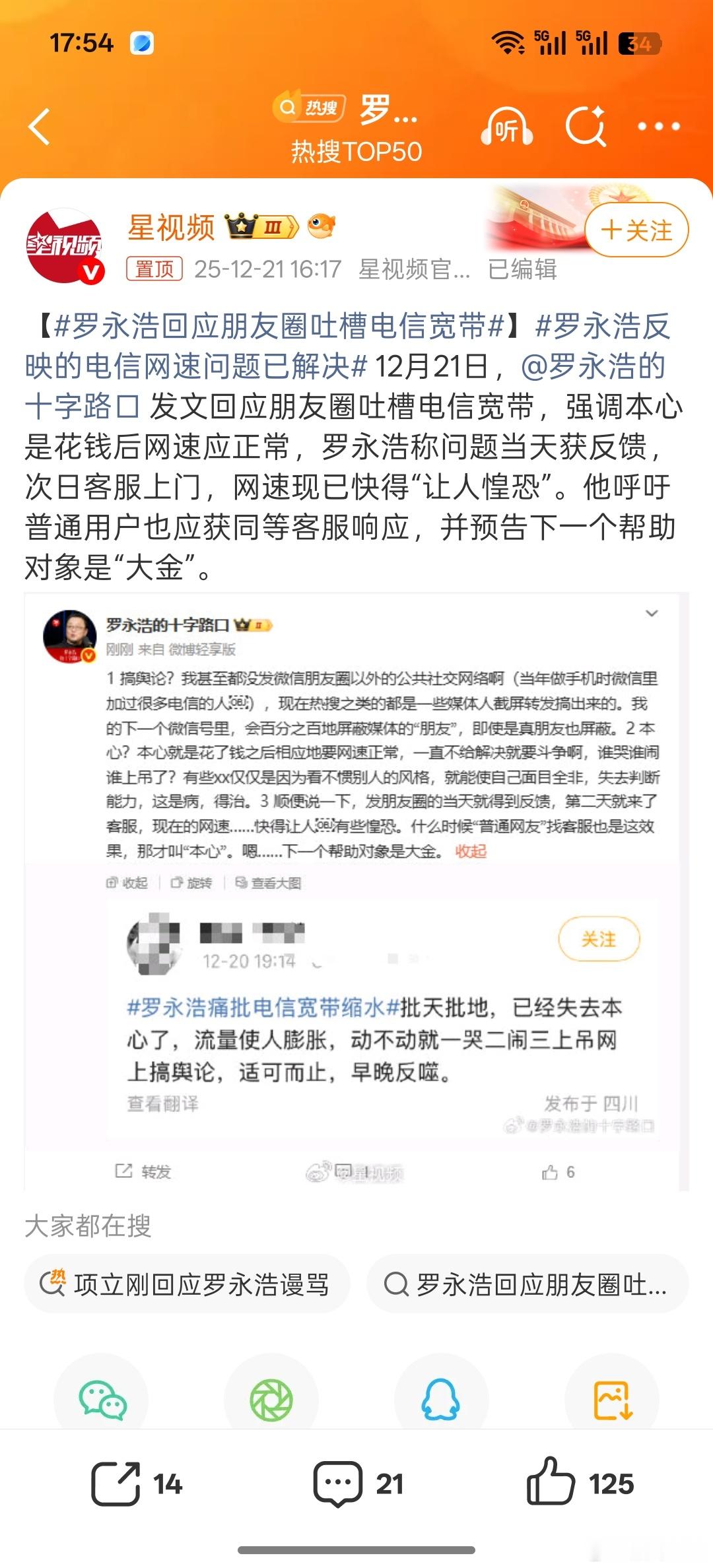 批天批地批空气,网友确实是一针见血,西贝、华与华、俞敏洪、红米K80用户、上海电信还有接下来的大金空调,这人以为他是网络管理员,哪里不爽就疯哪里。还是项立刚说得对,他除了一张嘴啥也不是!罗永浩反映的电信网速问题已解决