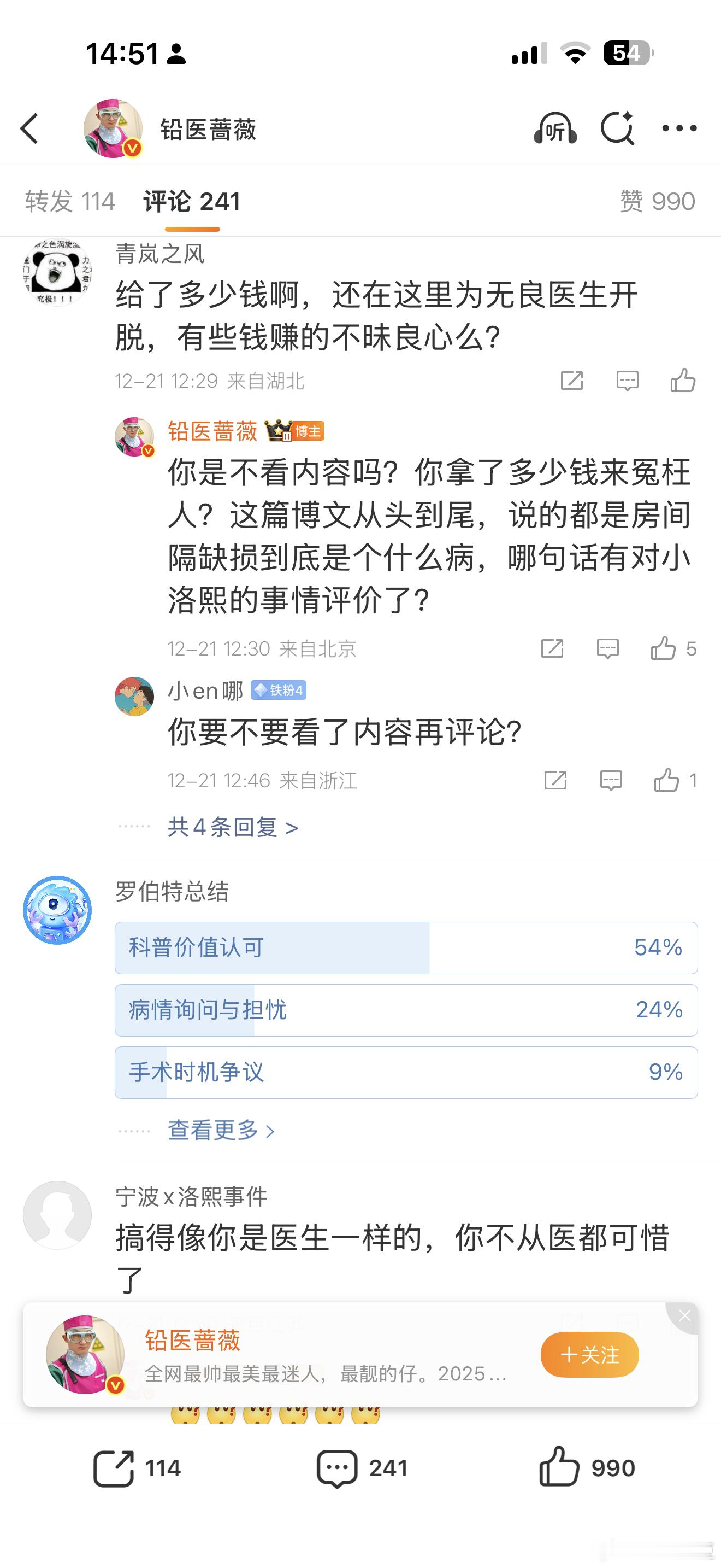 人家医生啥也没有评价,就科普了一些什么是房间缺损,就被喷无良医生。感觉这些人啥也不看,就只是负责喷,而且一张口就说污蔑别人收了钱。善良的网友,不要被这些人带节奏。总觉得有些有心之人打着为孩子维权的旗号,在激化矛盾