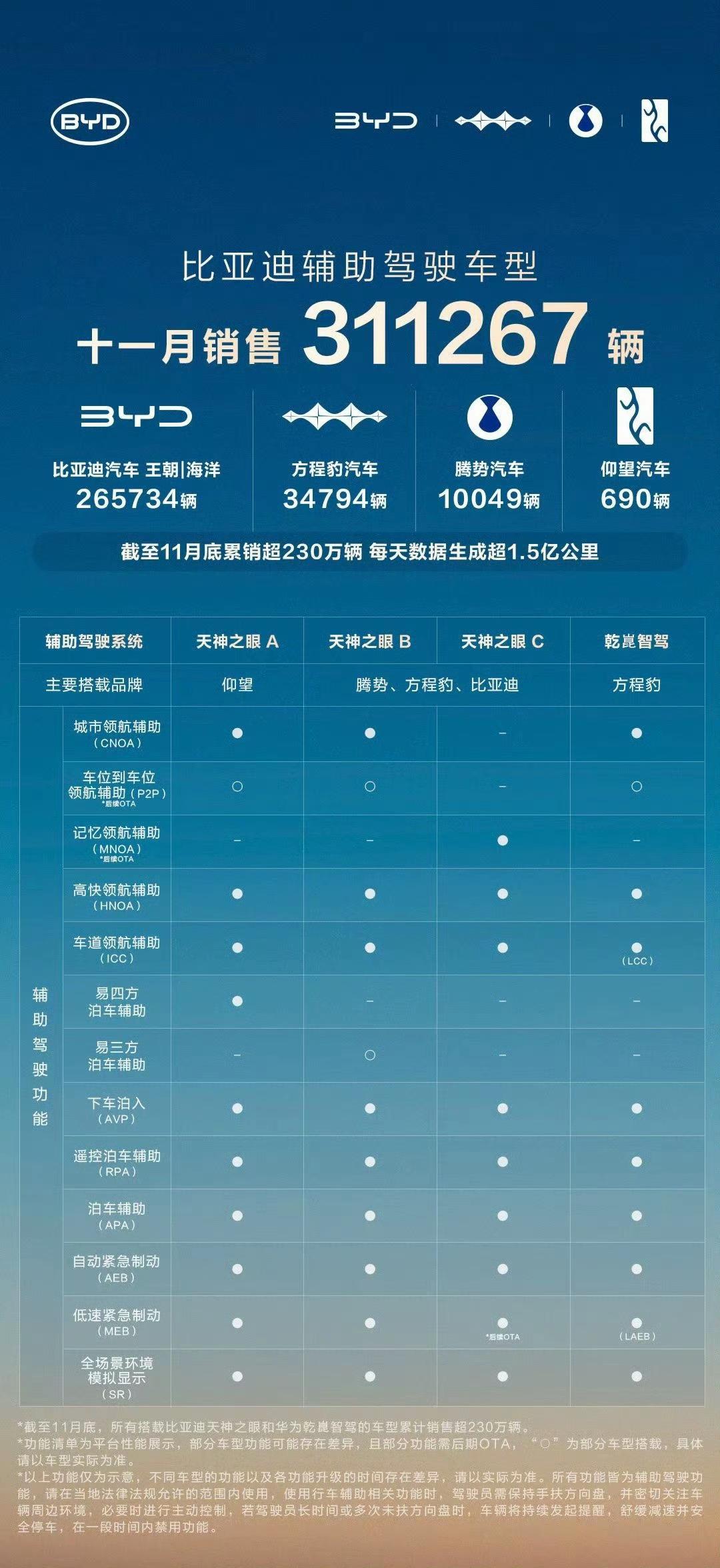 比亚迪正以硬核实力加速普及辅助驾驶!保有量超230万辆,每天生成数据超1.5亿公里,11月单月销量达311267辆! 很多人以为辅助驾驶离日常很远,殊不知在比亚迪等车企的深耕下,它早已悄然融入出行生活,成为靠谱的随行伙伴。而这一切的底气,来自比亚迪天神之眼辅助驾驶系统的强势渗透。11月,比亚迪天神之眼高阶智驾单月销量超31万辆,不仅刷新自身纪录,更一举让智能驾驶从高端专属,变成人人可享的大众刚需。 比亚迪能快速普及辅助驾驶,核心在于敢为安全兜底的魄力。今年7月,比亚迪率先推出“安全兜底”政策,泊车场景下的损失无上限赔偿,且不限首任车主。这份对技术的绝对自信,给万千用户吃下定心丸,让大家能放心选择、安心使用。 比亚迪的亮眼成绩,从不是偶然。它的背后,是强悍技术的硬核支撑,更是为用户兜底的十足底气。汽车市场智能化浪潮翻涌,中国汽车的智能突围之路,离不开比亚迪们的奋勇向前。行业早已变天!如今的竞争,早已跳出单一的配置与动力比拼,转向包含辅助驾驶在内的全维度较量。各大车企,这场智能赛道的硬仗,你们准备好了吗?【来自懂车帝车友圈】
