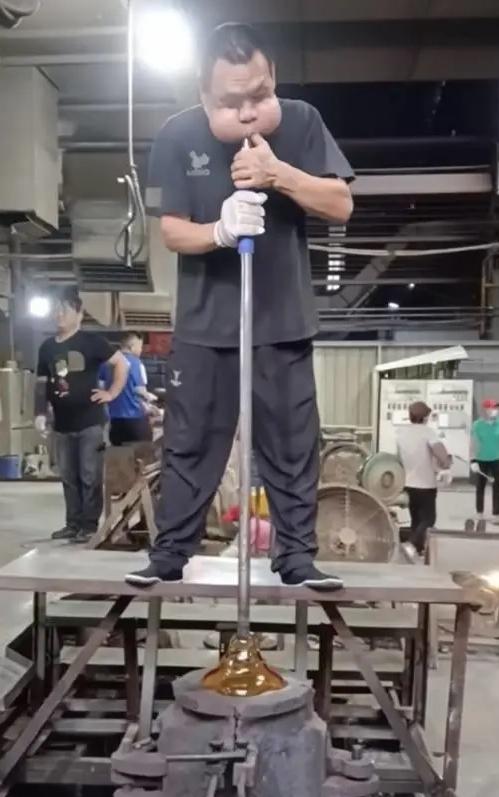 广东大叔走红,自称练成“蛤蟆功”! 一大叔最近在网上火了,但他这“火”法,真让人笑中带泪。 大叔在工厂干了整整30年的吹玻璃。因为常年高强度地鼓腮帮子吹气,他两边的脸颊肌肉严重变形,鼓起来的时候,活像一只“大青蛙”。网友们看着稀奇,给他起了个外号叫“青蛙王子”。 可面对这副模样,大叔却挺豁达,自嘲说自己这是练就了独门绝技——“蛤蟆功”。 说实话,刚看视频我也乐了,但这笑容没维持三秒。 了解完这行当的辛苦,我只有两个字:敬佩。 吹玻璃这活儿,听着简单,干起来那是真要命。工人们得对着上千度的高温熔炉,为了把玻璃吹成型,每天得反反复复用力鼓气、憋气。这就好比你每天不停地做几百个“吹气球”的动作,还得在火炉边,一干就是几十年。 刚入行时,大叔也是个面庞清秀的小伙子。可随着时间推移,这高强度的“面部健身”让他的肌肉彻底拉伤、松弛,才变成了现在的“气球脸”。 这哪是“蛤蟆功”?这分明是30年风吹日晒、高温炙烤留下的“勋章”! 向这位坚守了30年的老手艺人致敬! 大家怎么看大叔的这份“特殊技艺”?欢迎在评论区聊聊!