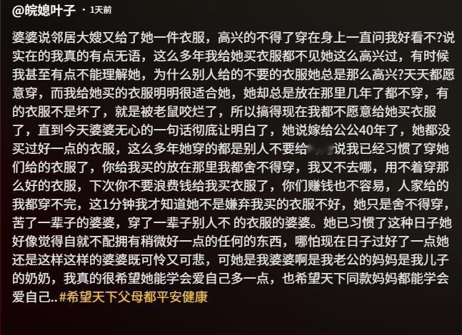 太心酸了!儿媳自从进门之后给婆婆买了很多衣服,可婆婆每次穿两天就收起来,反而一直穿别人不要后送给她的衣服,在婆婆又收了一件邻居送来的衣服后,媳妇忍不住问原因,没想到婆婆的一番话把儿媳说哭了,原来这不是嫌弃,而是苦了一辈子的舍不得。 这天上午,邻居家大婶送来一件不穿的红大衣,婆婆看到后爱不释手,马上穿在身上,一边照着镜子一边儿媳好不好看,可儿媳心里却一点也不高兴,自己花那么多钱买的好衣服婆婆不穿,偏偏要穿别人不要的衣服,搞得自己都不愿意给婆婆买衣服了。 面对婆婆的询问,儿媳没好气地说:为什么别人不要的衣服你穿着总那么高兴,我给你买的衣服你却放在那里几年了都不穿? 面对儿媳的询问,婆婆不好意思地低下头,沉默了好一会儿,才小声地说出了自己埋进心里的故事,原来,四十年前嫁给公公后,婆婆为了省钱就不再买好衣服了,平时都是用旧衣服对付着穿,这么多年一直穿别人不要的已经是成习惯了,而儿媳买的那些衣服都太好了,自己舍不得穿,自己又不去哪,用不着这么好的衣服,你们赚钱也不容易,人家给的我都穿不完...... 婆婆说完后,这次换成儿媳沉默了,眼眶不知不觉就湿润了,原来不是婆婆嫌弃衣服不好,而是习惯了过苦日子的婆婆舍不得穿新衣服,好像在婆婆心中自己就觉得自己不配拥有好一点的东西,哪怕现在日子好了也觉得不配。 儿媳走到婆婆身边,轻轻地把婆婆揽在怀里,心中暗下决心,婆婆将儿子养大,让自己有个好老公,自己也要给婆婆养老,让婆婆能学会自己多爱自己一点....... 看了这对婆媳的经历,打心眼里为她们感动,婆婆是个好婆婆,为了家庭操劳一生,老了也不愿意麻烦儿子儿媳,儿媳是一个善解人意明事理的好儿媳,了解到婆婆的苦衷后,打心眼里想为婆婆好,这才是婆媳关系的典范。 这位婆婆说的话也挺让我心里感触的,让我想起了我的父母,他们就是从小苦到大,舍不得吃舍不得穿,现在我给他们买好吃的,他们总想留到我回家时再一起吃,给他们买新衣服,宁愿在衣柜里放出灰了也舍不得穿,每每看到他们就是一阵的心疼。 其实人一辈子最重要的事情就是学会爱自己,学会取悦自己,酸甜苦辣是人生中都会有的,我们不只要能吃苦,还要学会让生活越来越甜,希望全天下的父母都能早点明白这个道理,其实我们每个人都人生,都可以少点苦多点甜。 你怎么看?评论区说说吧。