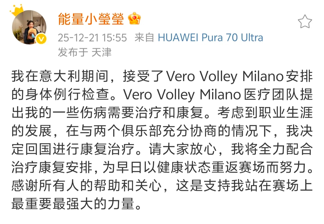 [ 子弹飞完了,李盈莹回天津养伤 ] 时间线回顾:11.28 意大利米兰俱乐部官宣李盈莹加盟12.1 李盈莹前往意大利这期间签约的消息为0,同时出国征战的王媛媛和庄宇珊都已经登场打球。让广大球迷猜测不断,还有担心去的不是意大利,是缅北现在尘埃落定,李盈莹回国养伤。李盈莹更新微博,天津女排也发了声明:“我俱乐部球员李盈莹近日在意大利米兰期间,按照 VeroVolley Milano(米兰排球俱乐部)安排进行了身体例行检查。米兰排球俱乐部医疗团队提出其一些伤病需要治疗和康复。经与球员本人、米兰俱乐部及经纪公司共同商议,李盈莹决定返回国内在熟悉的环境中进行相关的治疗和康复。我们完全尊重并支持这一决定。”中国女排力争第一时间直通奥运中国女排新老交替蓄力洛杉矶