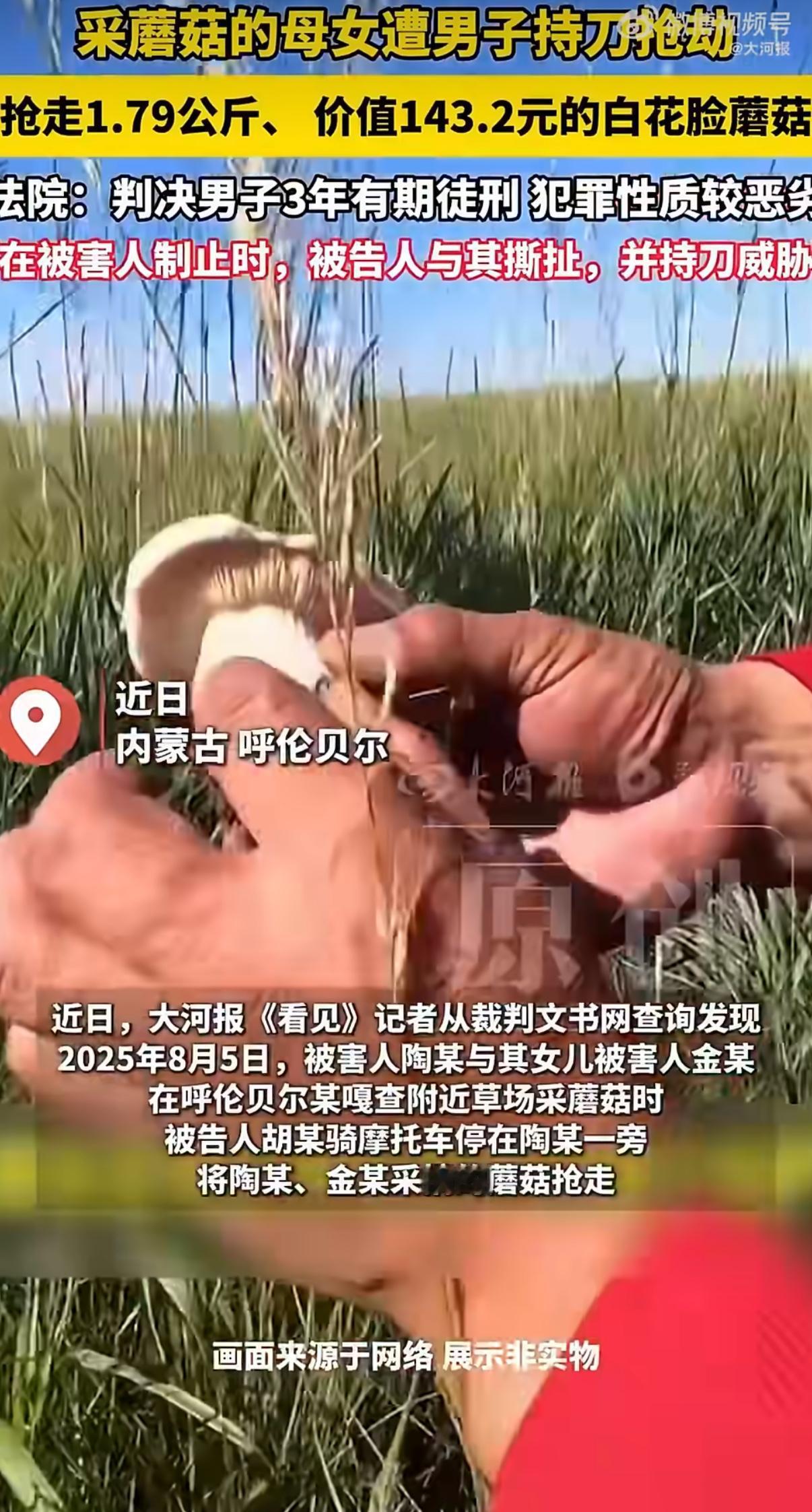 谁能想到,一袋才值143块钱的蘑菇,居然让一个人换来了三年牢狱之灾?这事听着像玩笑,却是真实发生的判决。一对母女在草原上辛辛苦苦采了1.79公斤的白花脸蘑菇,本来是想靠这天然的好东西补贴家用,结果半路杀出个骑摩托车的男子胡某,上来就抢。母女俩当然不愿意,上前制止的时候,胡某不仅跟她们撕扯,还直接掏出刀来威胁,最后硬是把这袋蘑菇抢走了。后来法院一审判决,胡某犯了抢劫罪,判三年有期徒刑,还得交2000块罚金。 很多人看了都觉得不可思议,143块钱连一顿好点的饭都不够,怎么就判这么重?其实这可不是法院小题大做,而是咱们的法律早就说清楚了的事。抢劫罪根本不看你抢的东西值多少钱,关键看你用了什么手段。只要是用暴力、威胁的方式抢别人东西,不管抢一块钱还是一百万,都构成抢劫罪,起步刑期就是三年以上。胡某都掏出刀了,这已经不是简单的抢夺,而是严重威胁到别人人身安全的抢劫,法院这么判完全是按法律来的,一点都不冤。 想想那对母女在空旷的草原上,面对持刀的歹徒,得多害怕?她们采蘑菇是靠自己的辛苦劳动,凭什么要被人用暴力抢走?如果就因为抢的东西便宜,就从轻发落,那是不是意味着以后有人可以随便用暴力欺负人、抢点“小东西”?那大家出门还能安心吗?法律要管的,从来不是那袋蘑菇的价值,而是这种“用拳头和刀子说话”的暴力行为。 胡某肯定到判刑的时候都没明白,他抢的不只是一袋蘑菇,更是别人的劳动成果和人身安全。可能他觉得这事儿不大,可对被抢的母女来说,这是一辈子都忘不了的惊吓。而且退一步说,就算蘑菇不值钱,暴力抢劫的性质就变了,这是在挑战法律的底线,必须付出代价。咱们常说“勿以恶小而为之”,现在看来,更不能“勿以暴力小而纵容”,不管是抢大钱还是抢小钱,只要动了暴力,就该受到严惩。 这起案子其实就是一堂生动的普法课,它告诉我们,法治社会里,暴力行为没有“小事”可言。每一个人的人身和财产安全都受法律保护,谁都不能仗着自己强势就为所欲为。143块钱的蘑菇和三年刑期,看似不成比例,实则是正义的精准体现。 你觉得这判决合理吗?如果换成是你遇到这种情况,会怎么应对?欢迎在评论区说说你的看法。 来源:大河报
