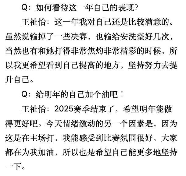 【王祉怡赛后采访:决胜局身体已到极限 不想辜负球迷的期望】Q:下来情绪有点激动,是为什么?王祉怡:第一个是感觉真的太累了。其实打到第三局,自己还是很想去拼,可能是身体有点跟不上了,出现了失误,自己的速度和节奏都慢下来了。Q:如何看待这一年自己的表现?王祉怡:这一年我对自己还是比较满意的。虽然说输掉了一些决赛,也输给安洗瑩好几次,当然也有和她打得非常焦灼非常精彩的时候,所以我更希望看到自己提高的地方,坚持努力去提升自己。2025年世界羽联年终总决赛