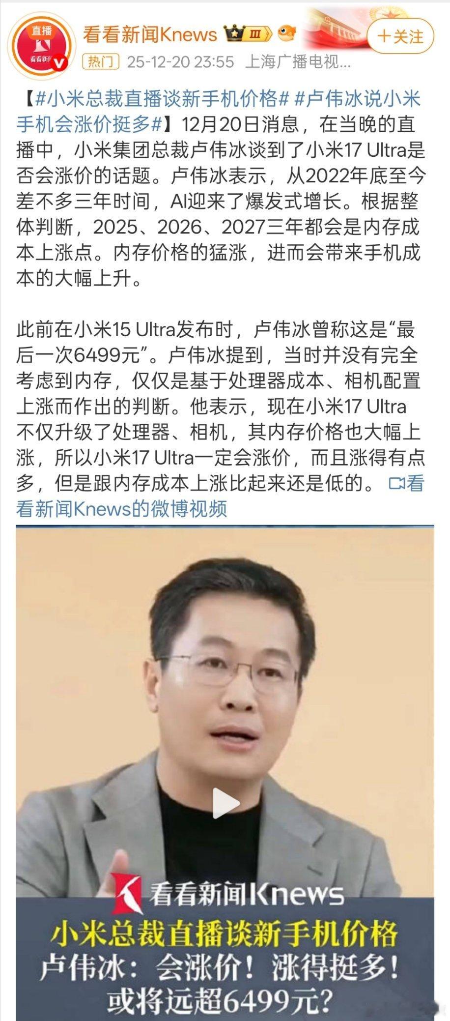 卢伟冰称小米新手机一定会涨价因内存的上涨成本的增加手机价格上涨📈是肯定的,但大