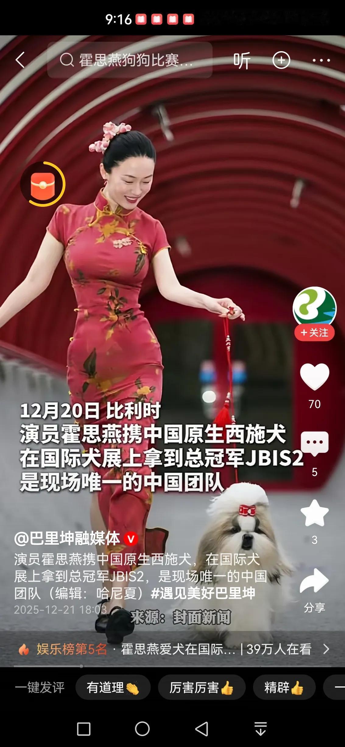 霍思燕好美呀[赞] 这身旗袍真的太适合霍思燕啦,把中国古典美展现的淋漓尽致,这身旗袍代表中国红儿,她真的很用心。 很早就喜欢霍思燕了,他们的孩子嗯哼在参加《爸爸去哪儿》的时候,感觉她和杜江把孩子教的很好,一家人也是三观很正的人。 看他们收养了好多狗狗,一定是善良的人,善良的人运气不会差,愿他们越来越好。