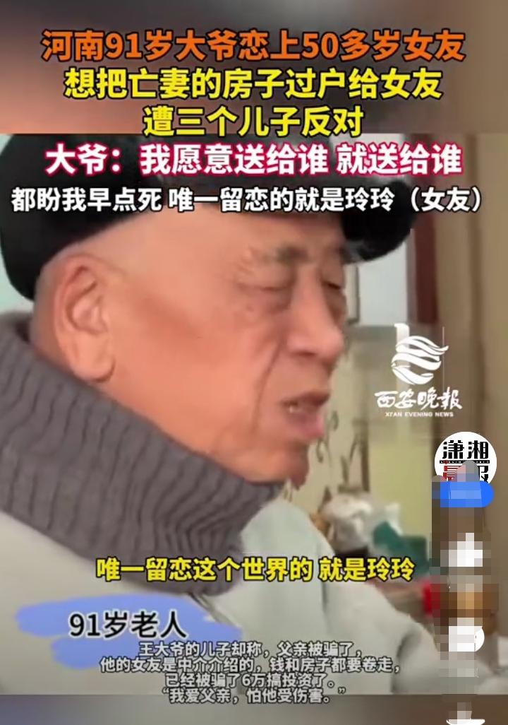 河南91岁大爷恋上50岁妙龄女友,才相处两个月两个人就坠入爱河!大爷年纪大了,最放心不下的不是儿子,而是这个女友玲玲!为了让玲玲的未来能够有一个安身之所,大爷想把亡妻的房子过户给这个玲玲,但是却遭到三个儿子的强烈反对! 玲玲每天陪着大爷聊天,带大爷逛街,逛公园,给大爷按摩,这让大爷感到前所未有的快乐和幸福! 然而儿子们却是另外一种说法,称父亲被这个女人给骗了,女人是中介公司介绍的,已经被骗了六万元去搞投资! 为了不让父亲继续被骗,儿子们不让玲玲继续跟父亲见面,但是看不到玲玲,父亲就不高兴,哭着闹着一定要玲玲陪着自己! 老人有退休金,平时不缺钱!孩子们平时都各忙各的,老人一个人确实很孤单寂寞!突然有一个体贴自己的女人,老人能够有这样的反应真心理解!孩子应该多多理解父亲!