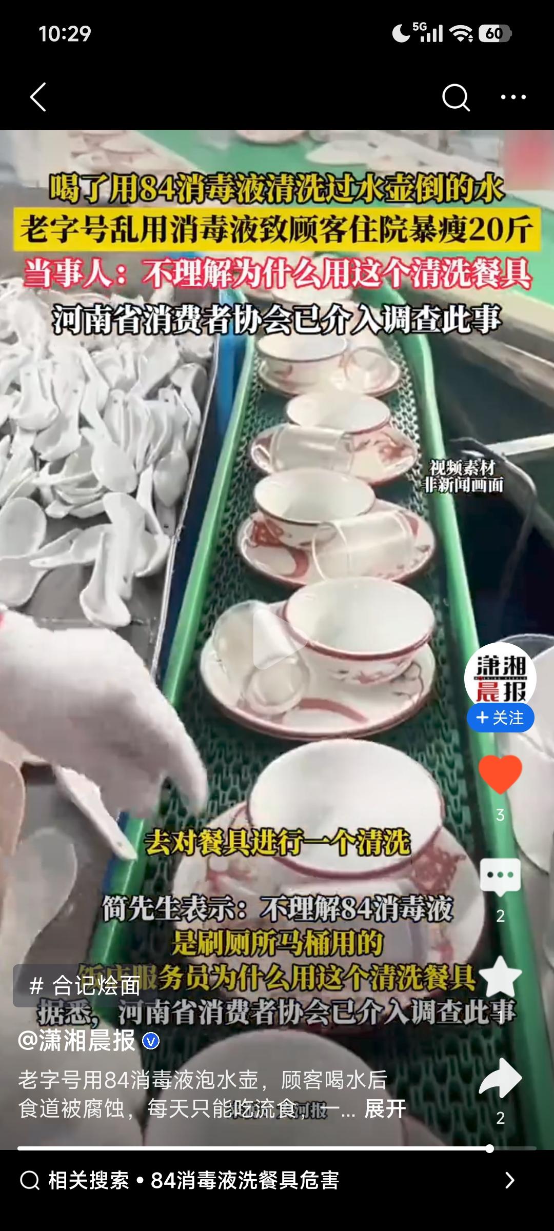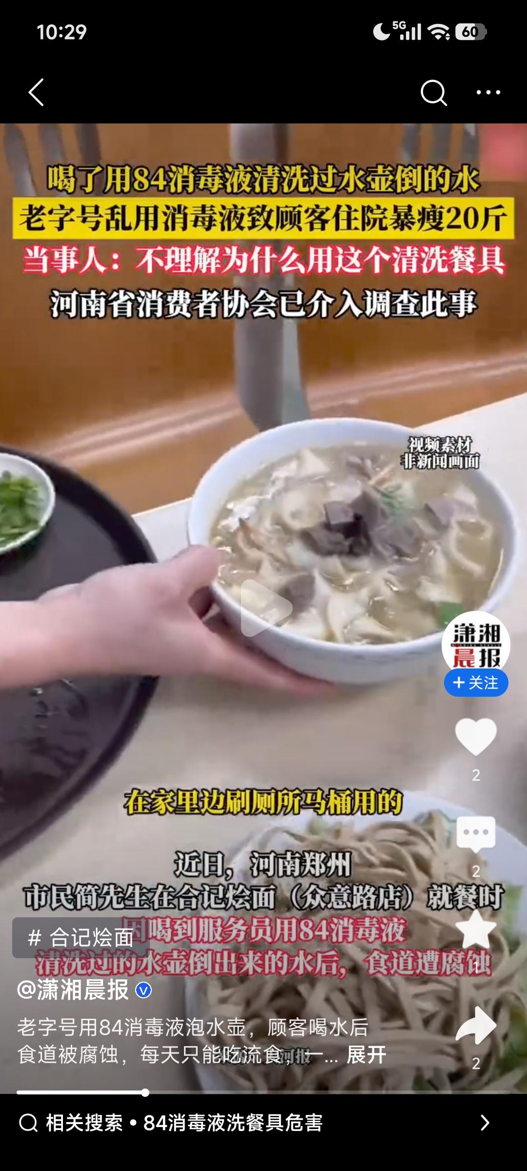 河南郑州的简先生太惨了!他在合记烩面(众意路店)就餐,喝了服务员用84消毒液清洗