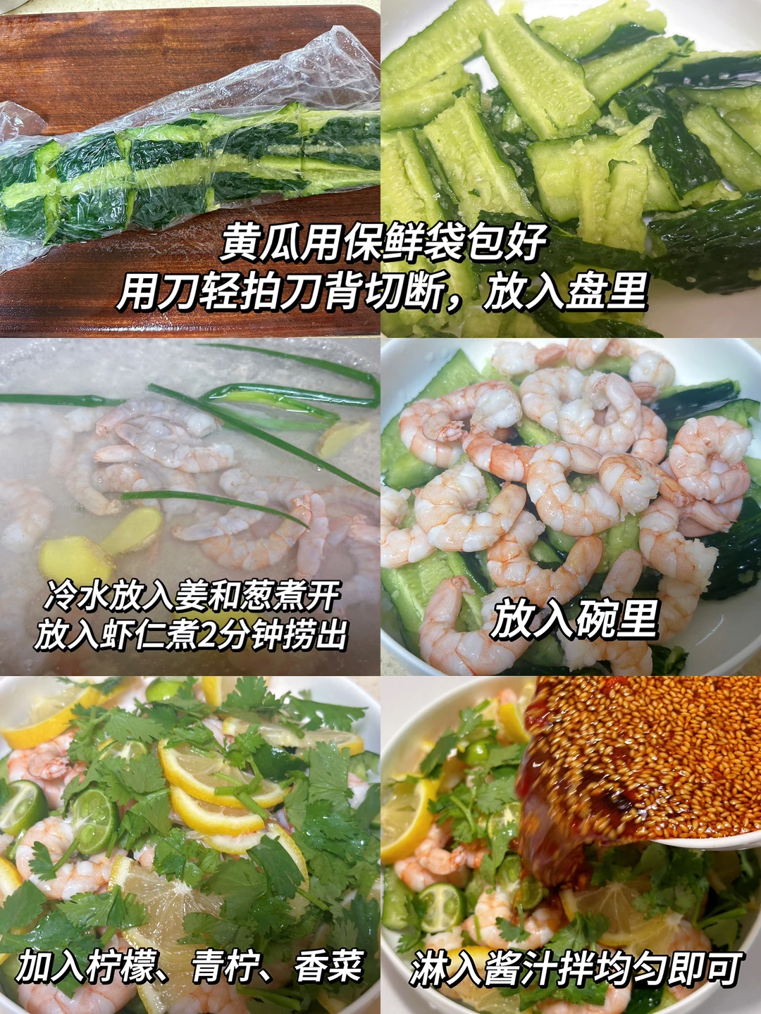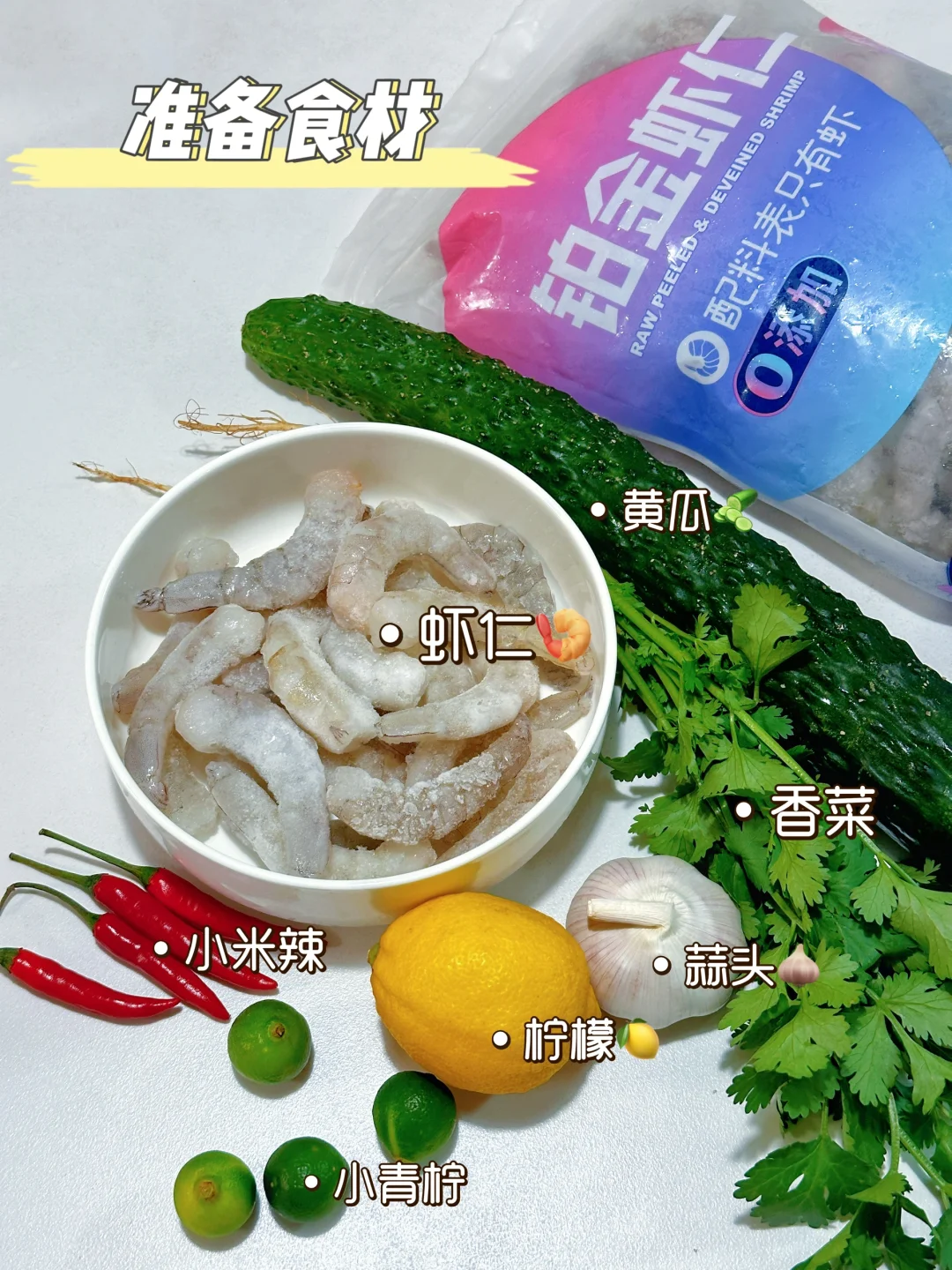 🥗食材:虾仁、黄瓜一根、柠檬半个、青柠4个、小米辣4个、蒜末、香菜、白芝麻