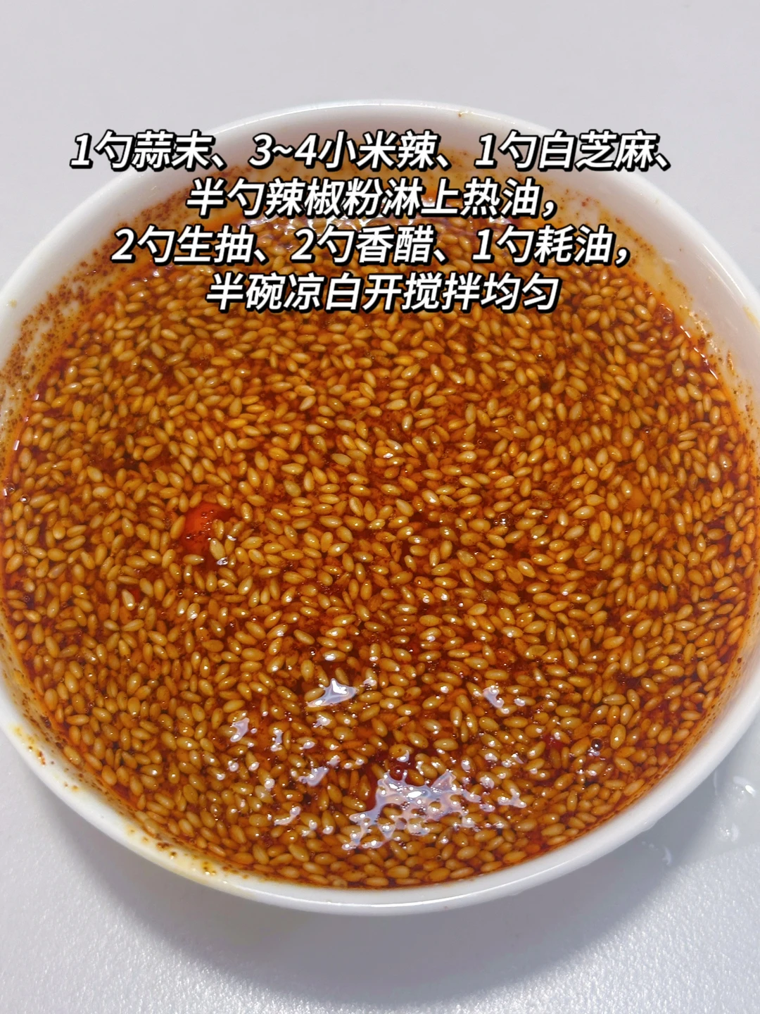 ✅酱汁:蒜末+小米辣+辣椒面+白芝麻淋上适量的热油(减油版可以直接用几滴香油/橄榄油调)激发香味+2勺生抽+2勺香醋(陈醋)+1勺耗油,半碗凉白开搅拌均匀