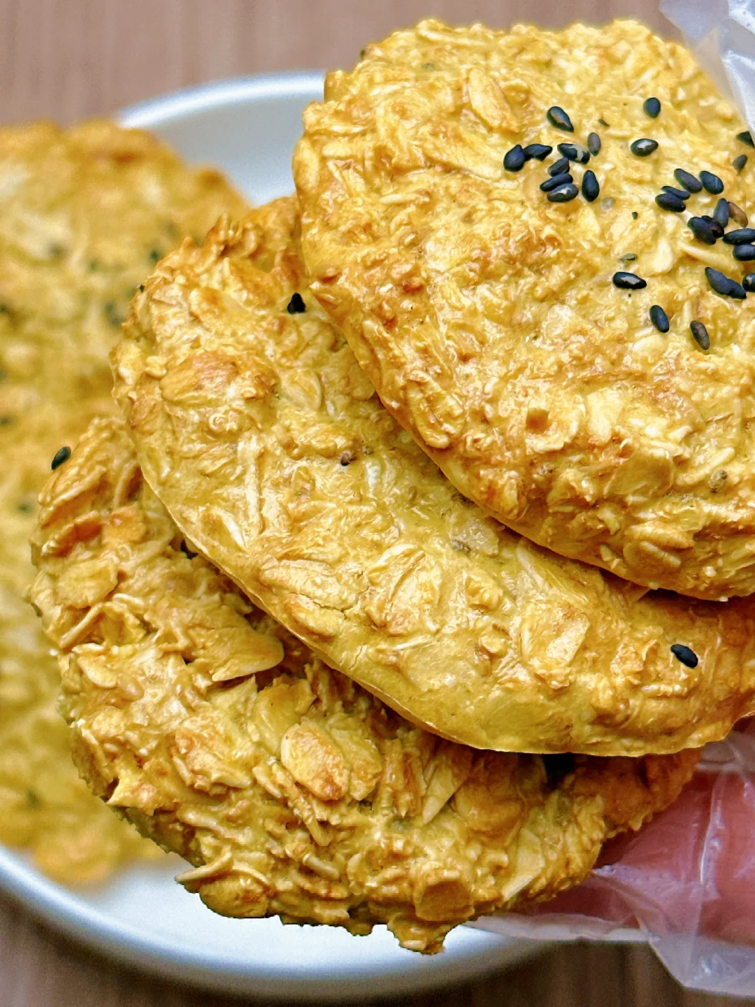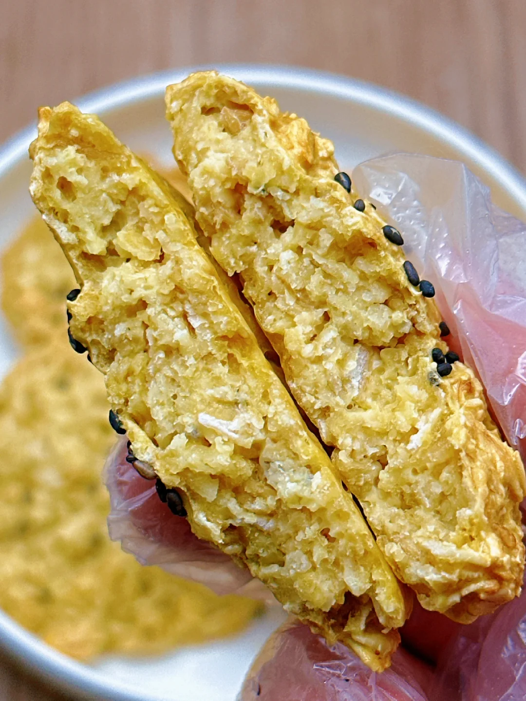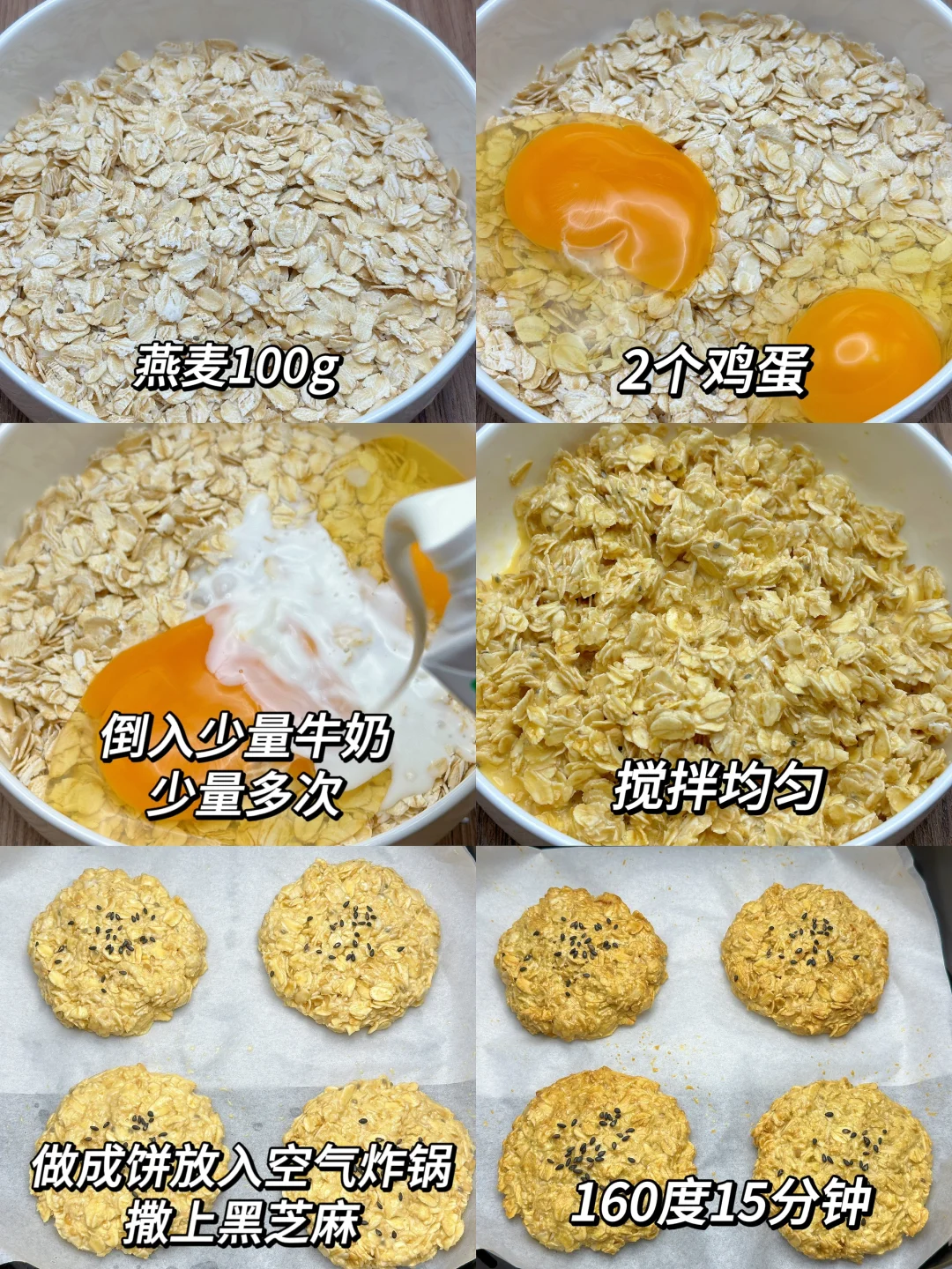 低卡又饱腹得鸡蛋燕麦饼,真没想到鸡蛋燕麦饼这么香,巨掉秤!焦香酥脆,奶香味浓郁,一口咬下去嘎嘣脆的,吃起来像华夫饼的味道!而且低卡又饱腹,喜欢的可以蘸点番茄酱哦,减脂期也可以放心吃哟,减脂期不知道吃啥的姐妹们快来试试吧!做法简单 🥗食材:燕麦、鸡蛋、牛奶、 🥘做法:步骤看图所示~ 1⃣️燕麦100g左右打入2个鸡蛋加入少量牛奶(少量多次,不要太稀了)搅拌均匀 2⃣️捏成饼,放入空气炸锅160度15分钟出锅开吃