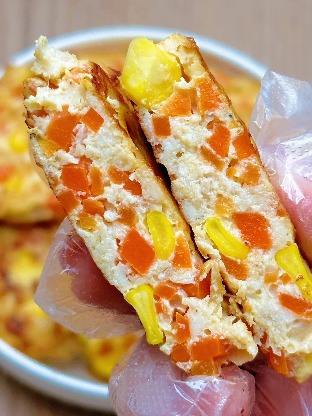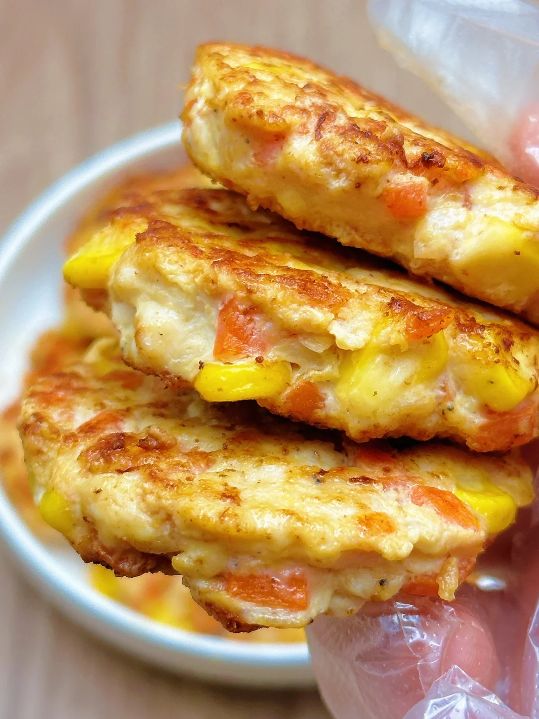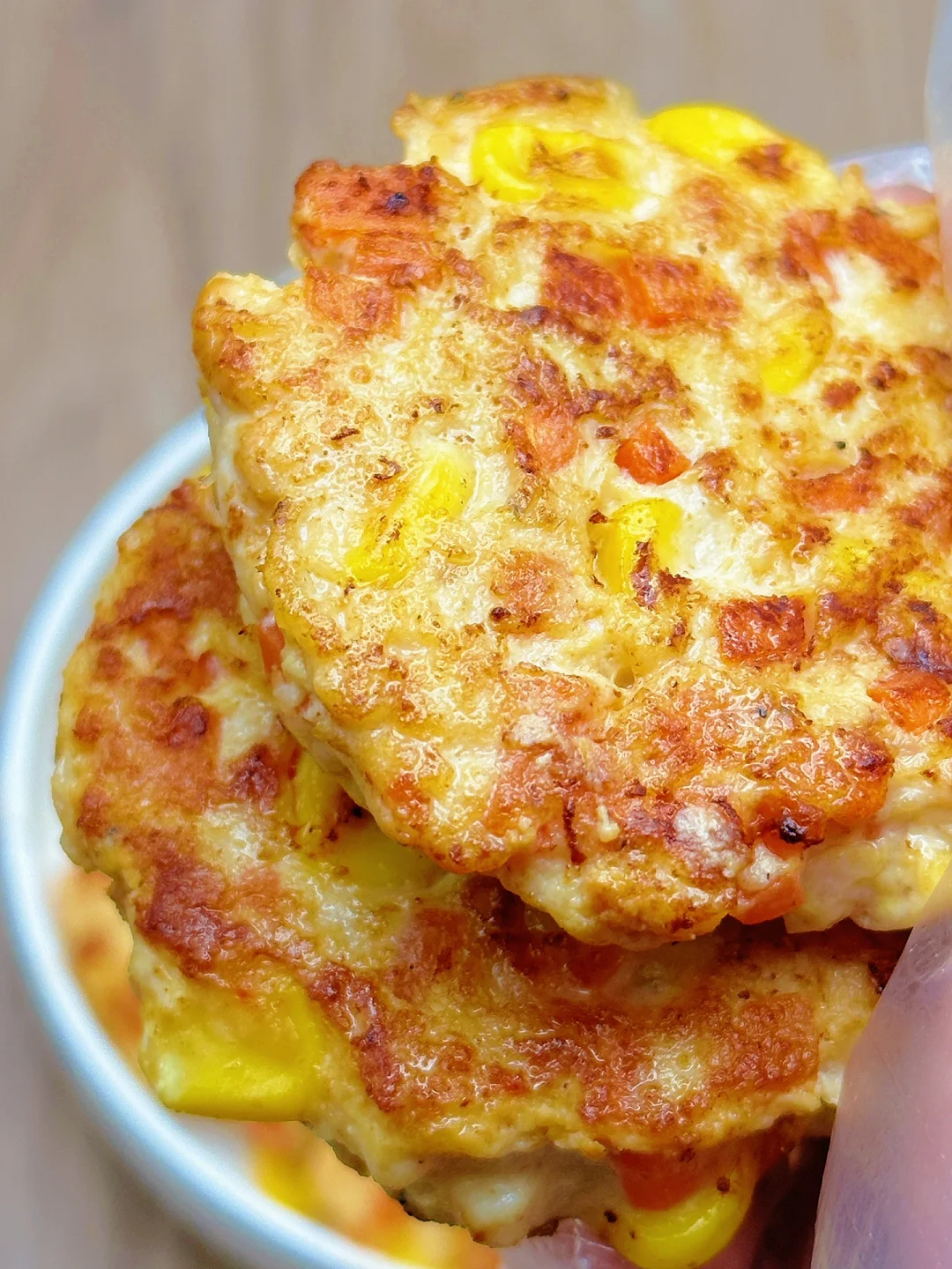 🥗食材:鸡胸肉、胡萝卜、虾皮、玉米粒(做了12个饼)