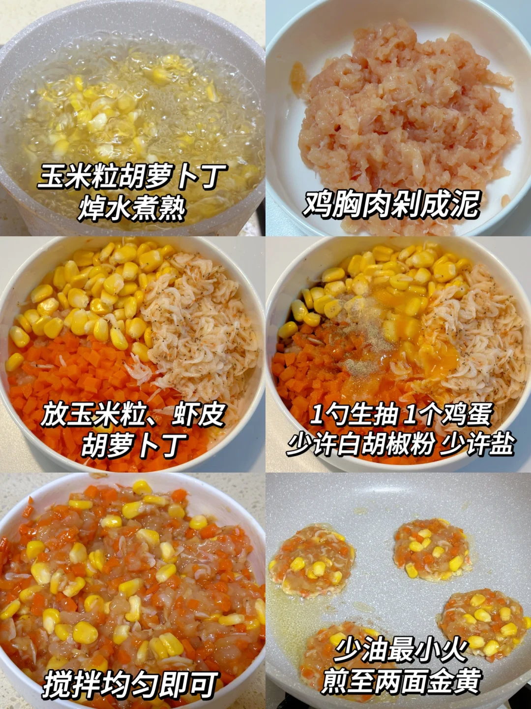 1⃣️把玉米粒、胡萝卜丁焯水煮熟,鸡胸肉剁成泥,加入虾皮、把所有食材搅拌均匀