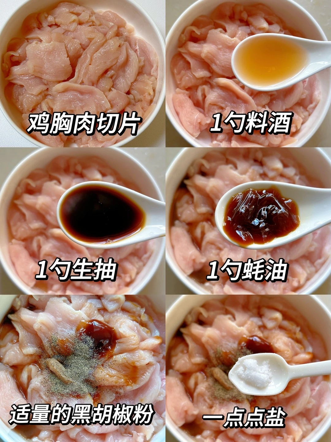 1⃣️鸡胸肉切片加入1勺料酒➕1勺生抽➕1勺蚝油➕适量黑胡椒粉腌制15分钟