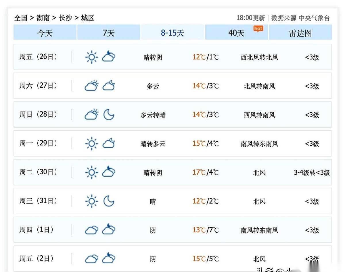 前两天我还跟人吹牛,说长沙这冬天过得像春天。 话音没落,一个大嘴巴子就抽过来了。 一觉醒来,气温直接给你打个对折,还带拐弯的。 昨天20度,今天就奔着个位数去了。 这哪是降温,这是直接从赤道把你空投到北极圈,连件羽绒服都不给。 最要命的,是下雨。 一下雨,整个世界都完蛋了。 那种冷,不是北方那种干巴巴的物理攻击,是湿漉漉、阴森森,能钻进你骨头缝里的魔法伤害。 空气里拧一把,都能挤出半斤水来。衣服永远晾不干,被窝永远是冰的。 在北京零下十几度我都没这么难受过。 真的,在长沙过冬的人,都有钢铁般的意志。 刚才刷手机,突然看到个消息说,月底那几天,可能……可能不!下!雨!了! 我反反复复看了三遍,差点叫出声。 天知道我有多久没见过太阳了。 求求了,老天爷。 别的啥也不指望了,就让长沙出几天太阳吧。 只要不下雨,这个冬天,就算对我们仁至义尽了。