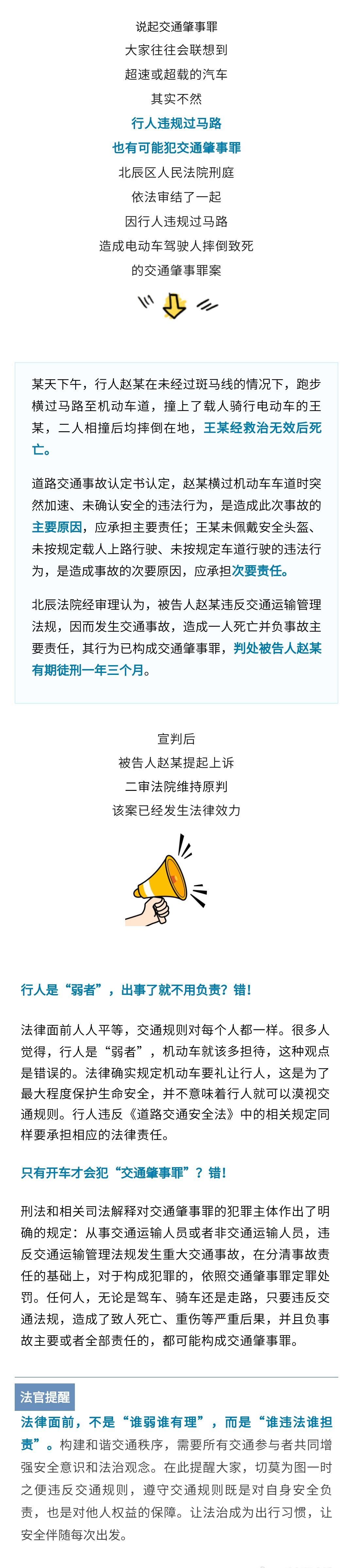 【行人违规过马路致他人死亡被判刑】近日,北辰法院审结一起交通肇事案,行人赵某违规过马路,与骑行电动车的王某相撞后倒地,王某不治身亡,赵某被判有期徒刑一年三个月。(微北辰)